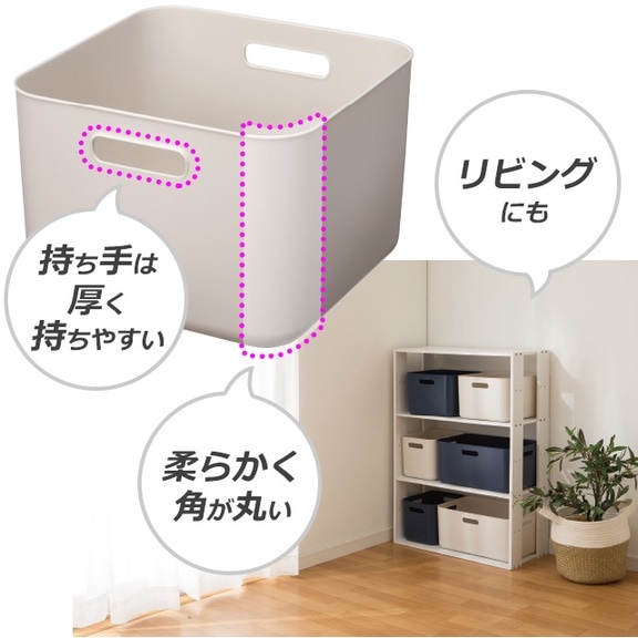 ポリエチレン素材のため柔らかく、角が丸い形状の収納ボックスです。