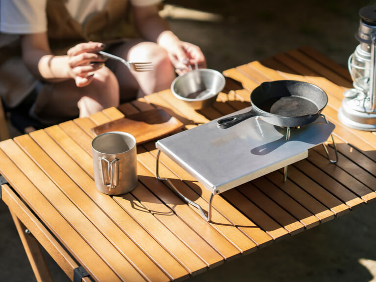 ステンレス製のキャンプ用ローテーブルは耐熱性が高いのが特徴。スキレットなどの熱くなりやすい鍋をテーブルに乗せても変形する可能性は低いでしょう。