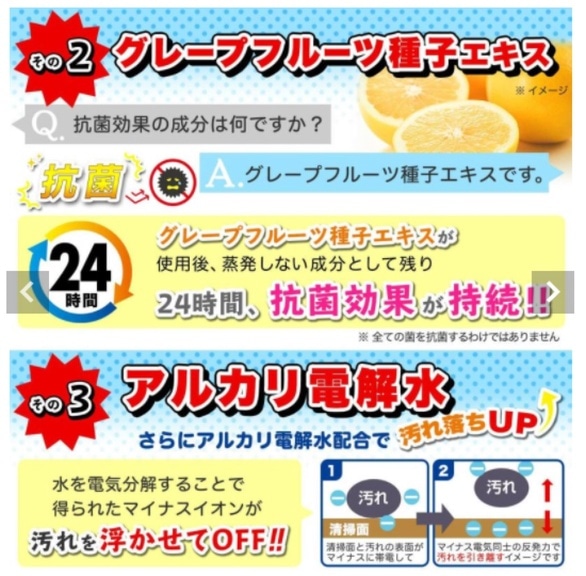 ●高濃度アルコールとアルカリ電解水とグレープフルーツ種子エキスの3つの力で汚れを落として除菌・抗菌・ウイルス除去もできます。