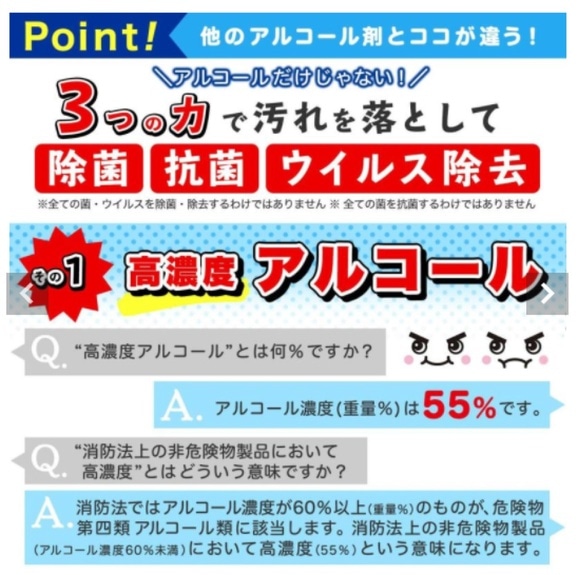 ●高濃度(※)アルコール配合!※消防法上の非危険物製品において高濃度。