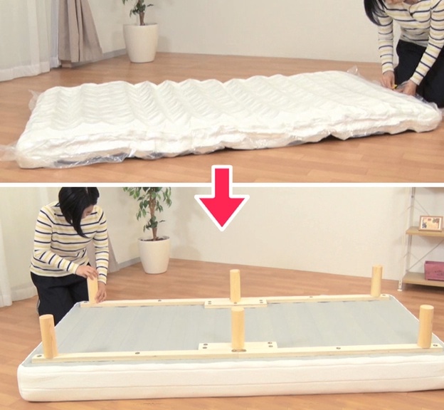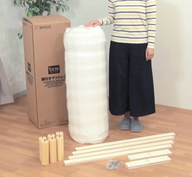 2018.02.21<br><br>今回は梱包が小さく、車などで持ち帰りできる圧縮タイプの脚付きマットレスをご紹介します。真空のパッケージを開封後、マットレスに桟と脚をつけて完成!女性でも組み立て簡単です!