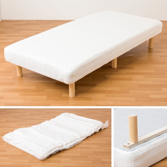 梱包が小さいので車などで持ち帰りできる圧縮タイプの脚付きマットレスです。真空のパッケージを開封後、マットレスに桟と脚をつけて完成です!体をしっかり支えるコイルで寝心地も快適!ベッド下のスペースには収納ボックスが入るのでとっても便利♪