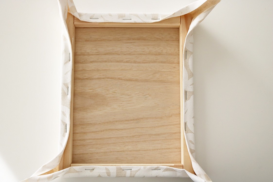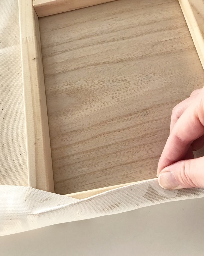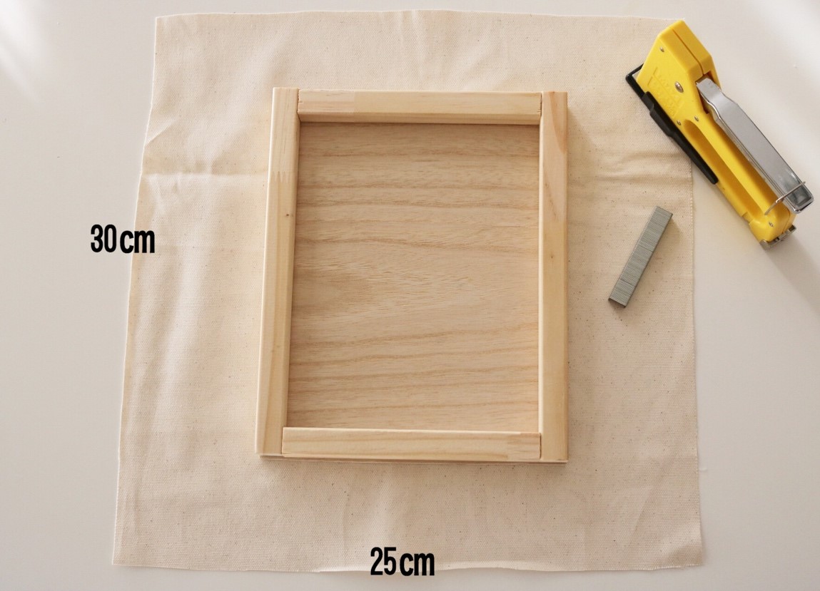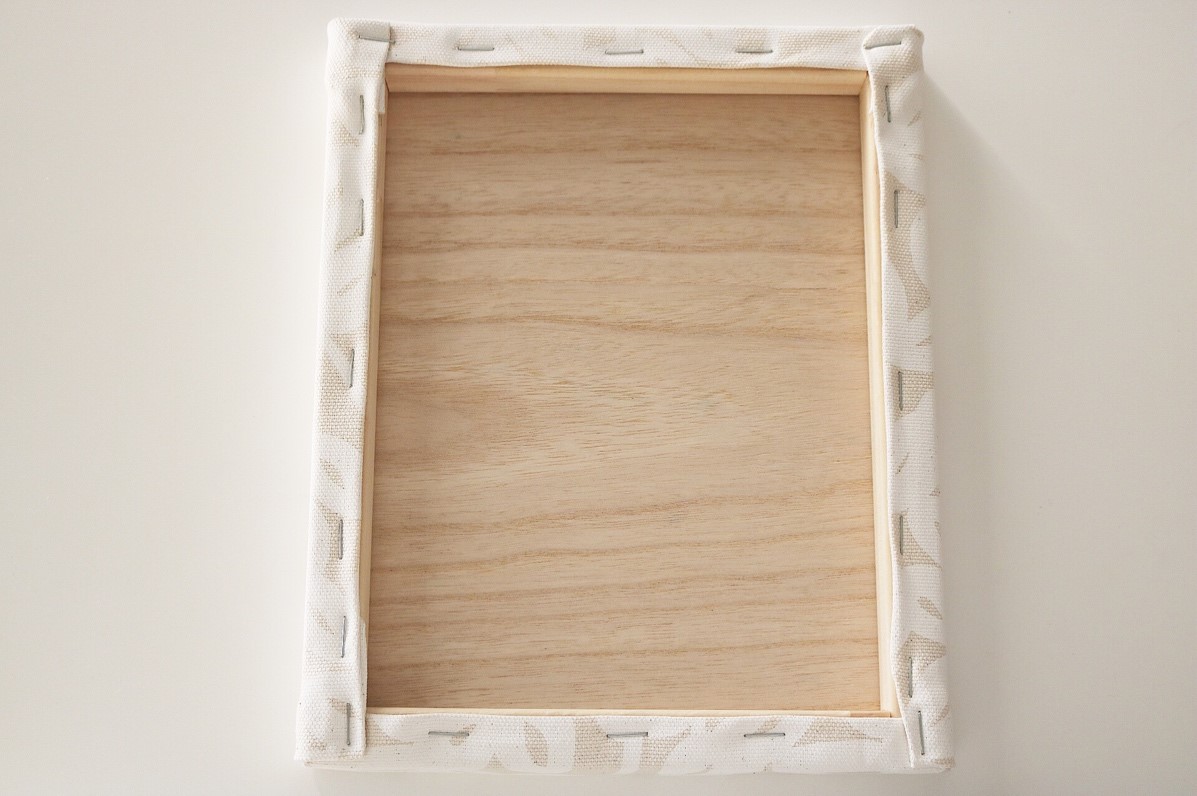 木枠の真ん中から布の端を折り込んでタッカーで留める。