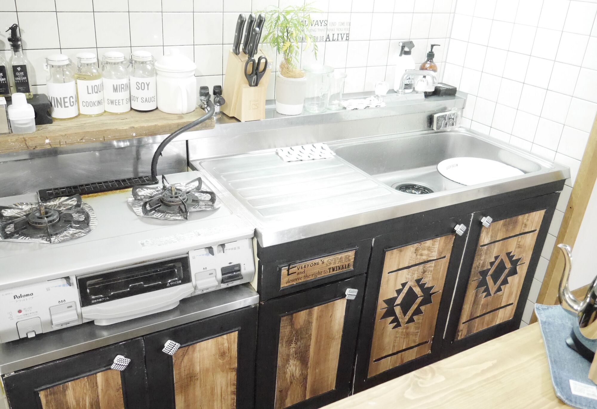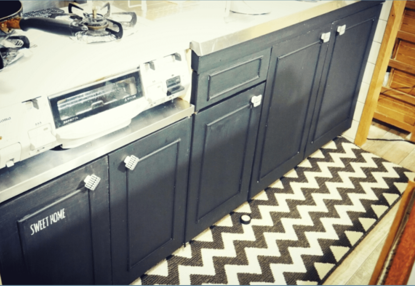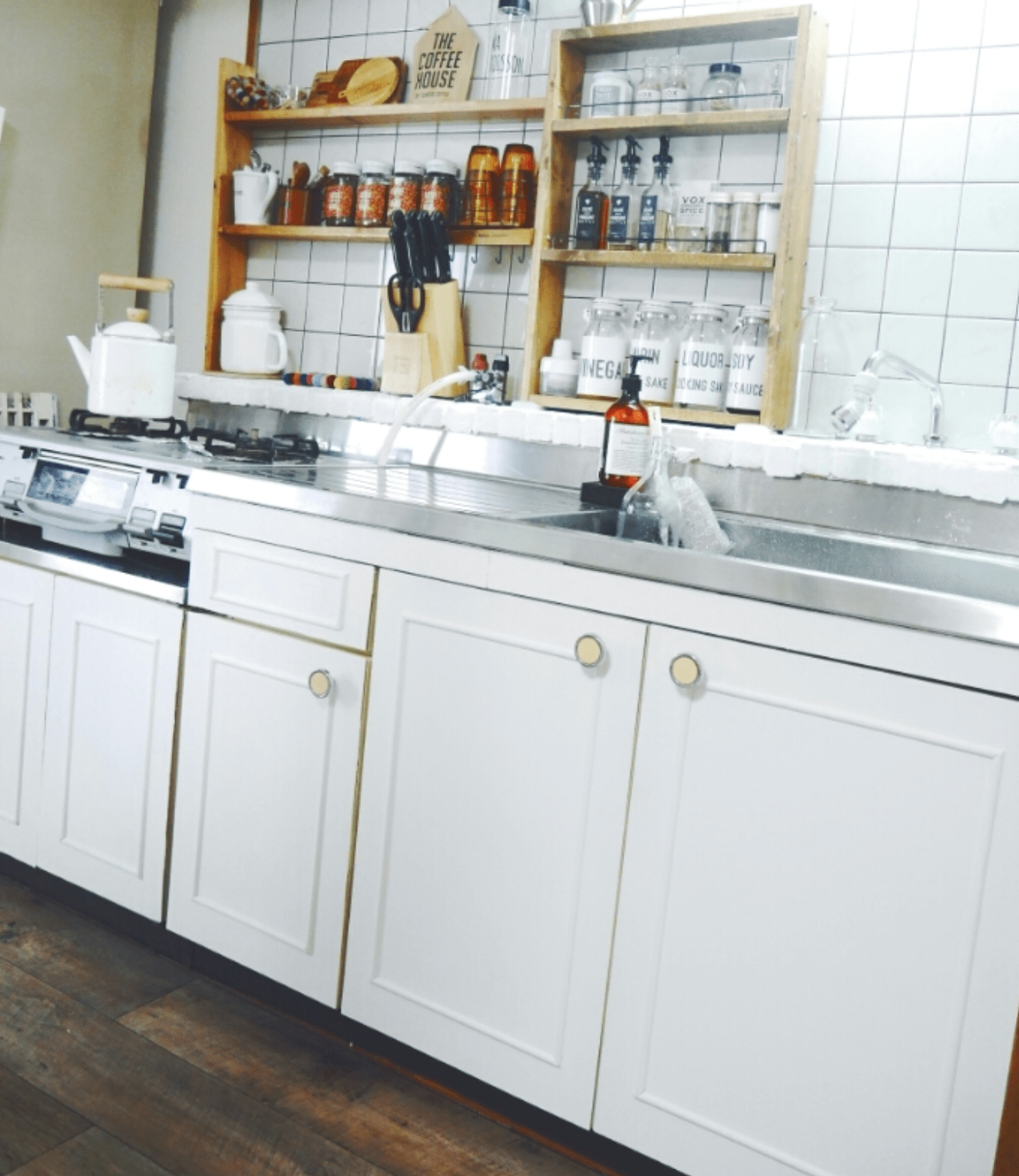 ↑こちら入居時のキッチンです。光で白っぽく見えていますが、実際の扉の色はクリーム色で何だか古くさく感じてしまうのがとても嫌でした。
