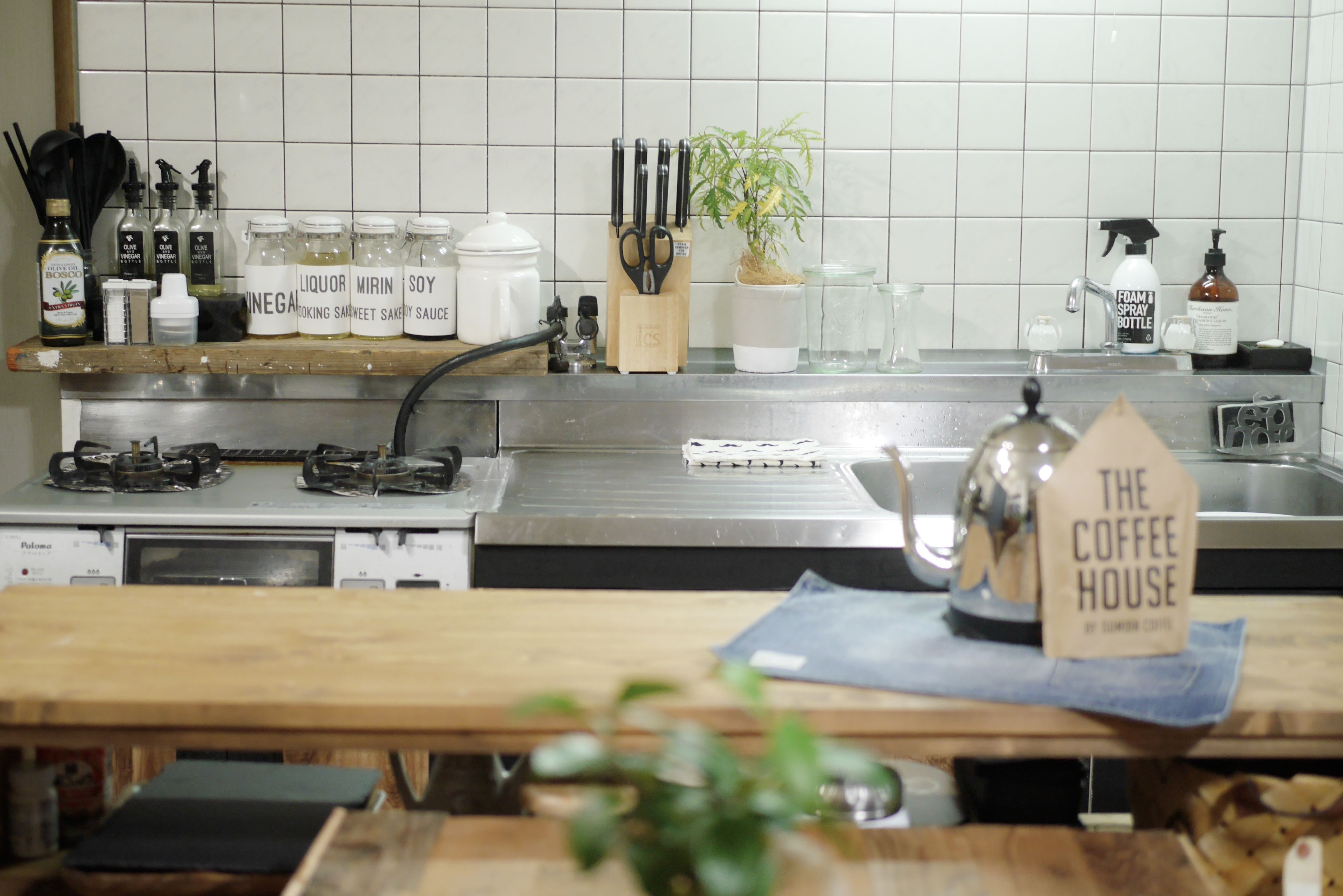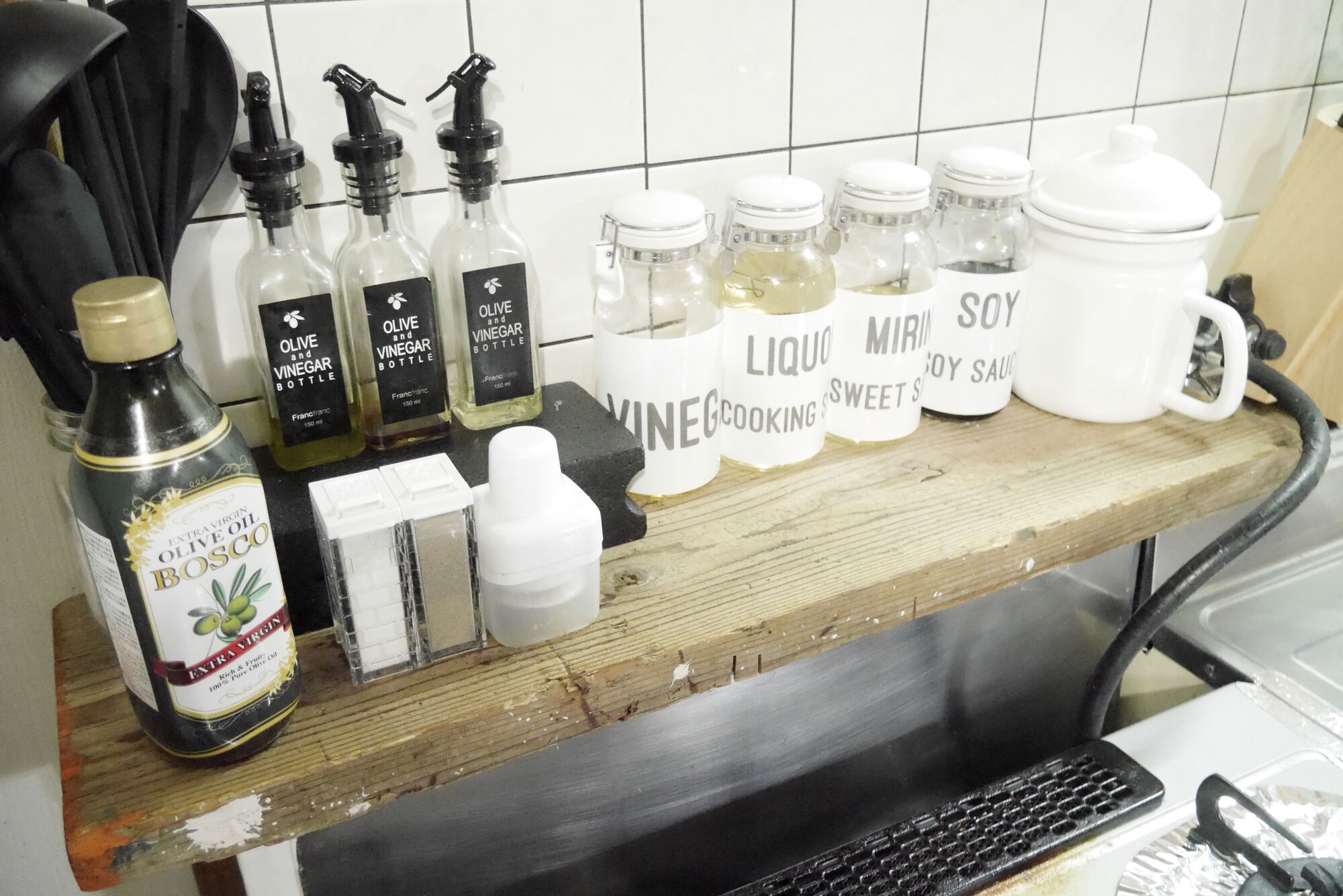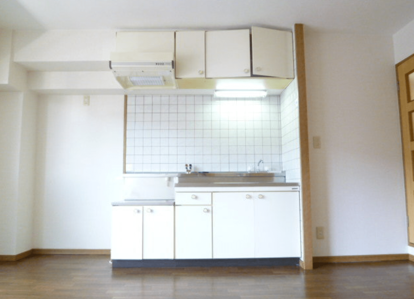 ↑こちら入居時のキッチンです。光で白っぽく見えていますが、実際の扉の色はクリーム色で何だか古くさく感じてしまうのがとても嫌でした。
