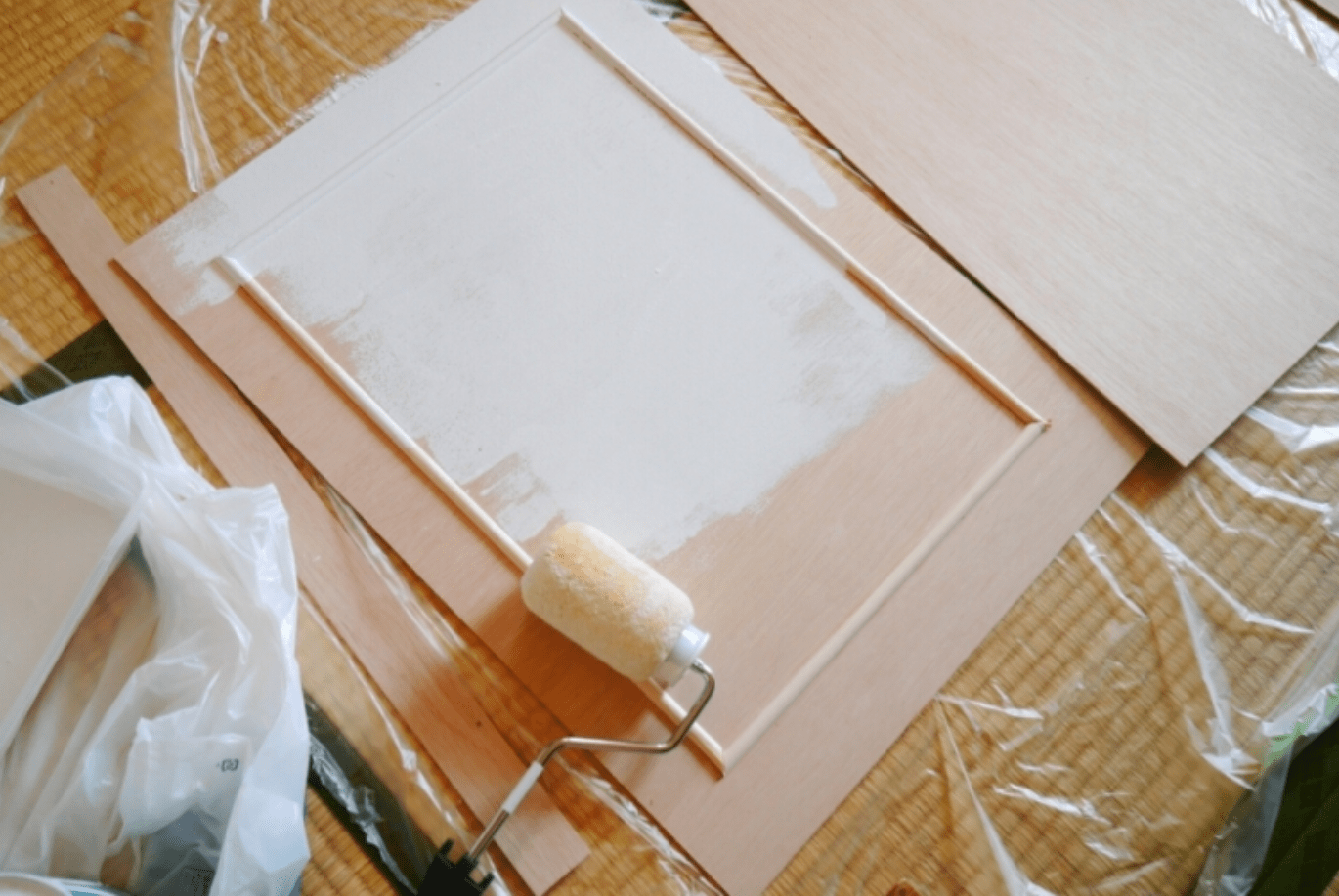 ベニヤ板の裏にマスキングテープと両面テープをつけて扉に貼ります。