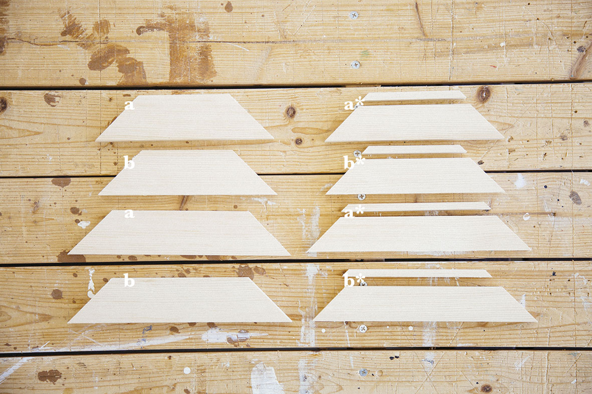 ※写真右側は木材a、bをそれぞれ2本ずつ225x35x32mm、180x30x32mmでカットしたものと、その端材。