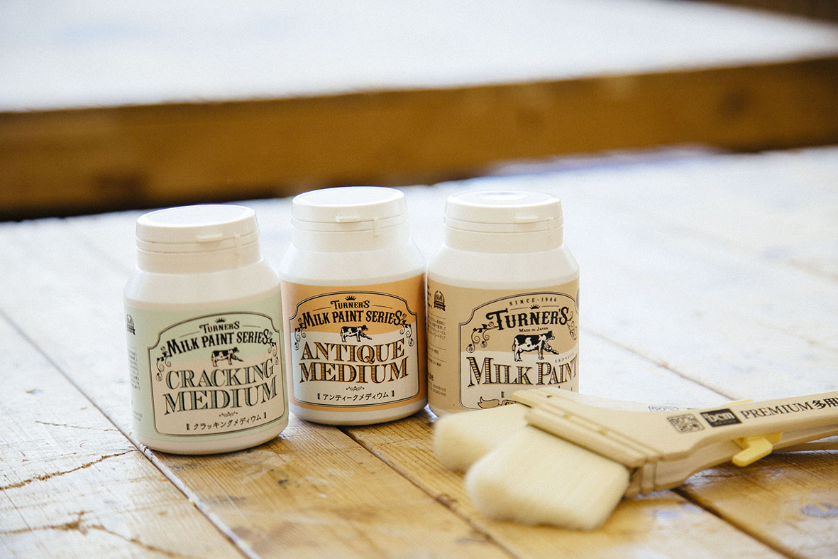 今回の塗装には、ターナー色彩のミルクペイントシリーズを使用します。左から順番に、割れた表面を表現するクラッキングメディウム、経年変化したような雰囲気を演出するアンティークメディウム、ミルクペイントです。