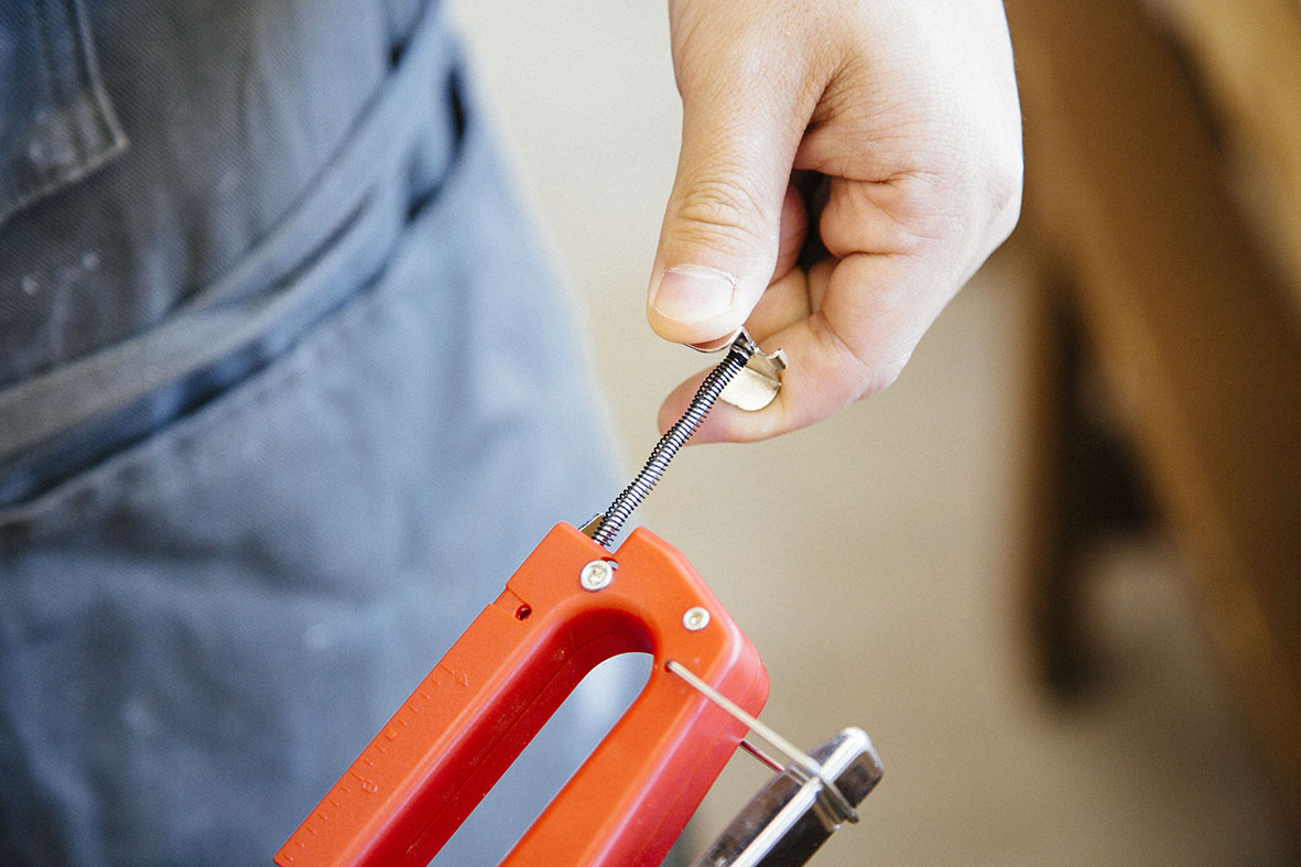 作業に入る前に、簡単にタッカー&ホッチキスを使い方をご紹介。まずは、本体の底部にあるステープルホルダーを引き出します。