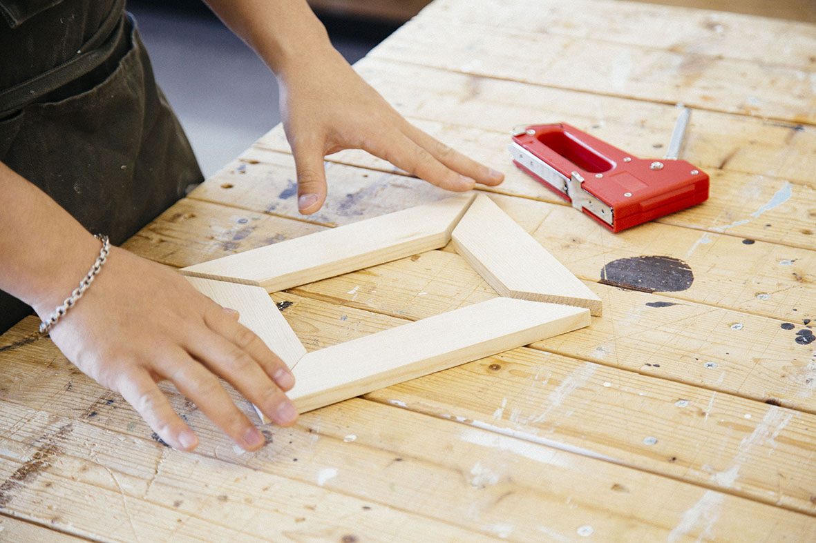 実はこちらの材料、すべてのカットが店舗内に構える「マイスター工房」で購入した木材をカットしてもらったもの。つまりはタッカー&ホッチキスと木材さえ用意してしまえば、フォトフレームが簡単にDIYできてしまうんです。ほかにも、曲線のカットなども対応してくれます。