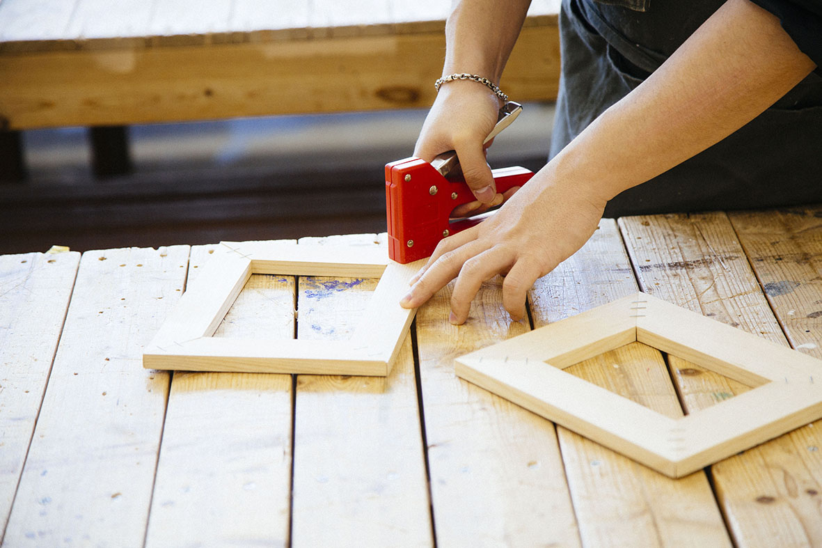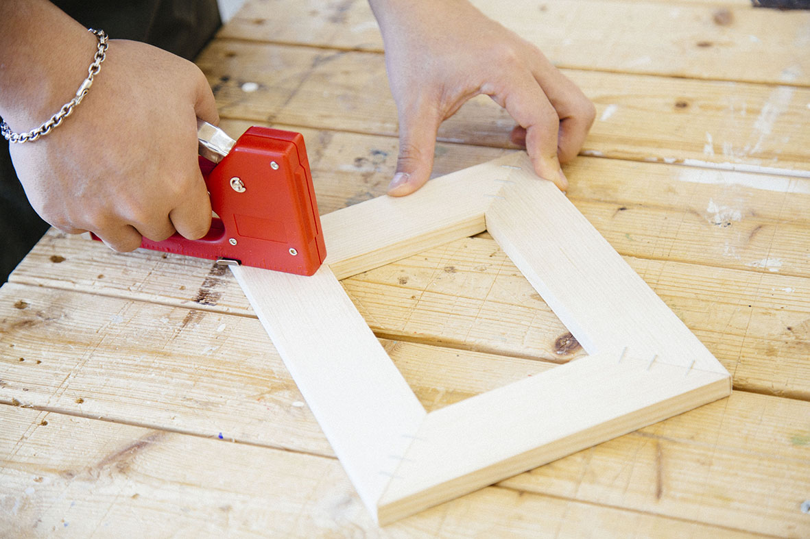 続いて、フレーム同士の側面にタッカーを打ち込みます。4辺それぞれ2ヶ所ずつ固定すれば完了です。