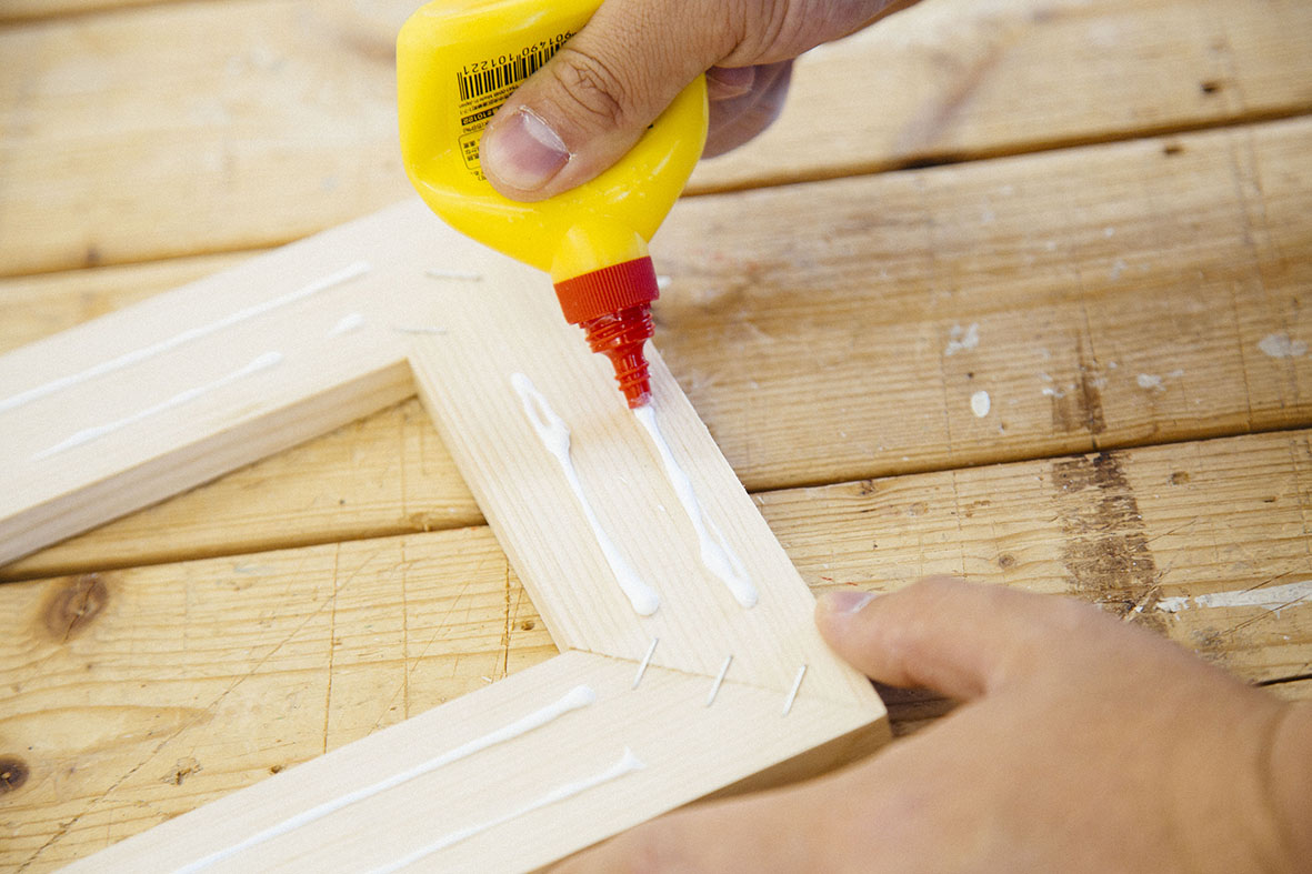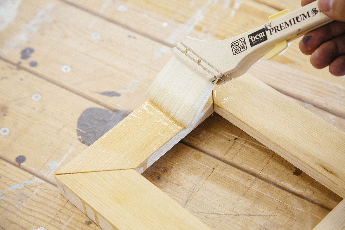 まずは木工用接着剤を塗布します。タッカーを打ち込んでいる面同士が向き合うように固定しましょう。