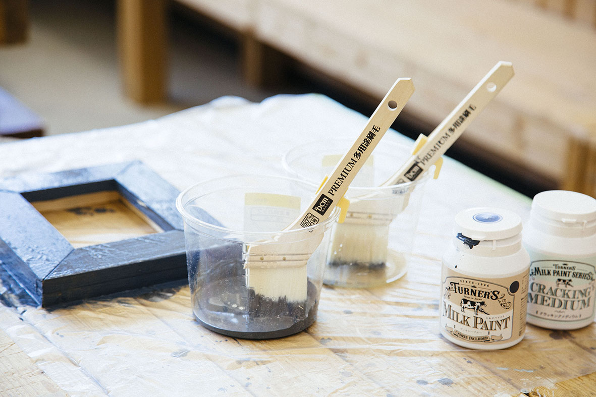 まずは紙やすりで表面をきれいにしたのち、クラッキングメディウムを塗布します。塗った直後にミルクペイントなどで色を乗せることで、乾燥した際にパリパリと割れた表面を作り出します。