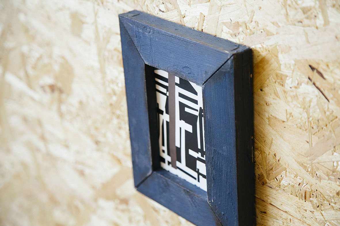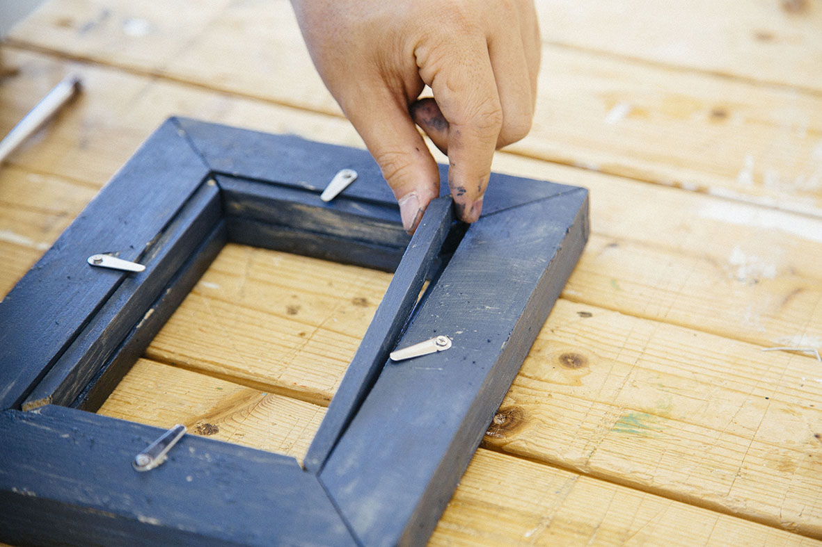 塗料が乾燥したら、内枠が広い方のフレームへ、留め金具を取り付けます。そこへ幅を短く切った際に出た端材をはめ込めば、写真が固定される仕様となっています。