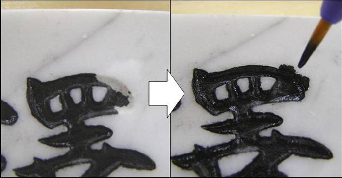 補修箇所のホコリや汚れを水洗いできれいに掃除し良く乾燥させてから、先が細めの絵の具筆などで塗ります。必要に応じてマスキングテ-プなどで補修箇所を養生して下さい。
