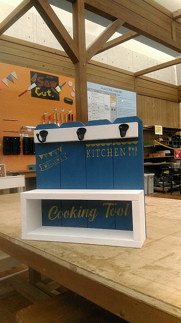 カット済の木材を電動工具で組み立て、水性塗料やワックスで塗装します。中に棚があるのでコップの収納などキッチン周りの収納に大活躍♪キッチンやリビングテーブルの上などちょっとした空間のインテリアにも可愛い作品です。