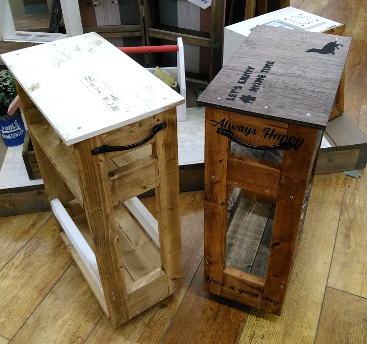 カット済みの木材を電動工具で組み立て、水性塗料やワックスでペイントします。DIYの基本である箱の組み立てや丁番の取り付け方が学べます。DIYツールの収納はもちろん、小物収納にも使える便利でかわいいボックスです♪