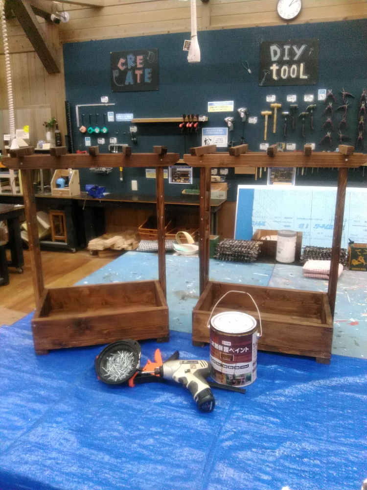 カット済みの木材を電動工具で組み立て、水性塗料でペイントします。カフェ風の屋根がポイントです。リビングやキッチン、お子さまのおままごとにもピッタリの棚を一緒に作りましょう。