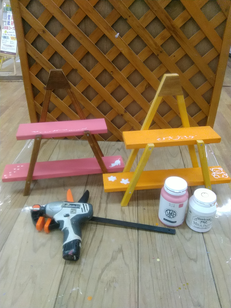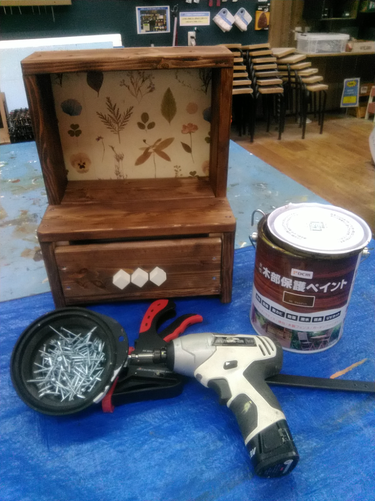 カット済みの木材を電動工具で組み立て、ワックスと水性塗料でペイントします。カラフルな天板がポイントの、階段型の飾り棚としてもおすすめの作品です。お子さんやお孫さんと、普段使う踏み台を一緒に作ってみませんか?