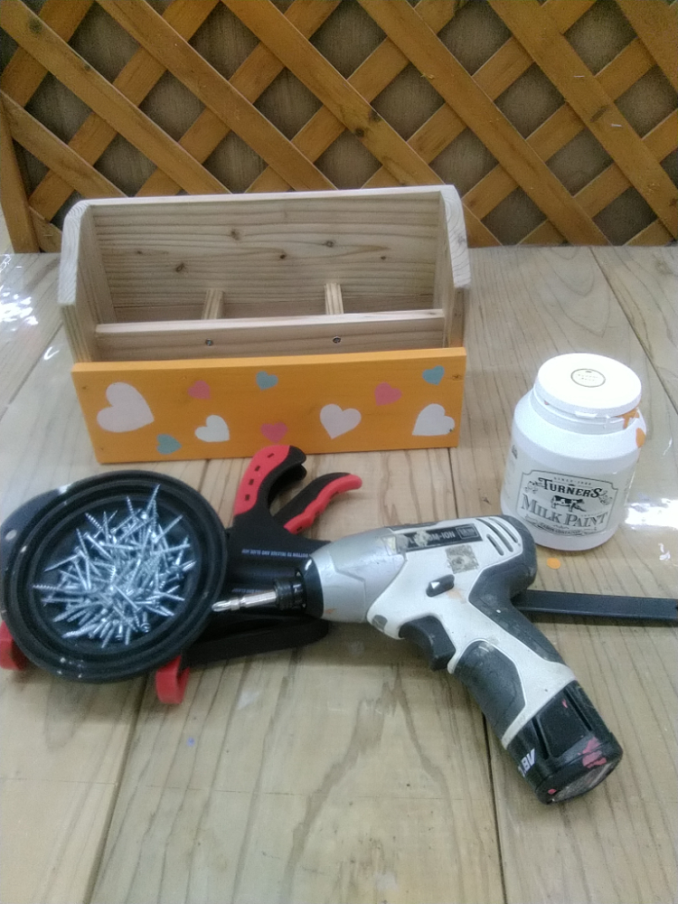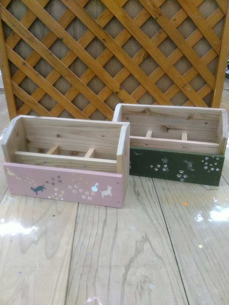 カット済みの木材を電動工具で組み立て、水性塗料でペイントします。正面のプレートがポイントのナチュラルでシンプルな傘立てです。