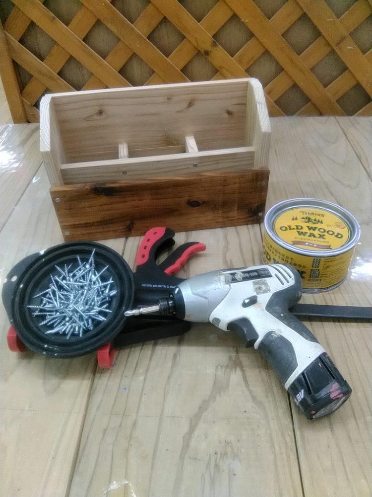カット済みの木材を電動工具で組み立て、ワックスでペイントします。持ち運びに便利な持ち手付きです。開いたまま見せる収納として使ってもおしゃれなスパイスBOXです。