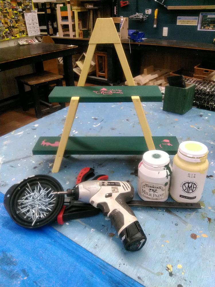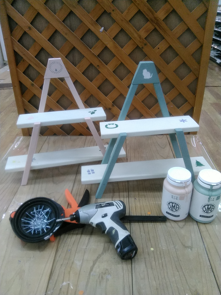 カット済みの木材を電動工具で組み立て、ワックスと水性塗料でペイントします。棚板を脚部にはめ込むだけで組み立てができるので、持ち運びにも便利です。キャンプなどのアウトドアだけでなく、インテリアとしても活躍しそう♪棚と脚の色を工夫してオリジナルのラックをつくりましょう!