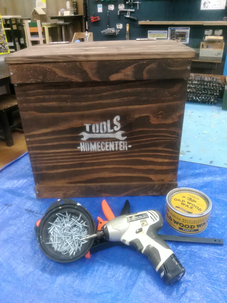 カット済みの木材を電動工具で組み立て、ワックスでペイントします。天板の内側に足をたため、取っ手のひも付きなので持ち運びも便利です!ご自宅だけでなくキャンプやBBQなどアウトドアライフも自作ギアで楽しみませんか?