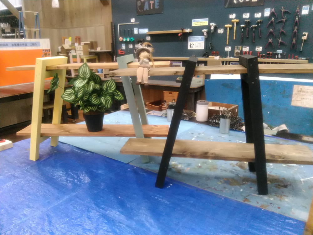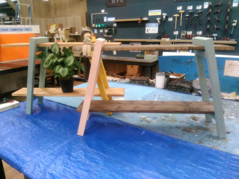 カット済みの木材を電動工具で組み立て、木部保護塗料でペイントします。花台部分と壁面へ花や雑貨と併せて飾ったり、目隠しとしても活躍します。