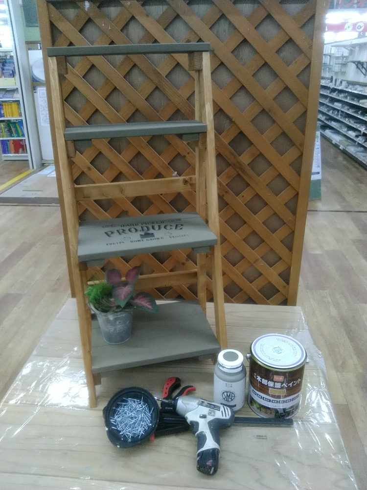 【午前1回の開催です】カット済みの木材を電動工具で組み立て、ワックスと水性塗料でペイントし、ステンシルで仕上げます。防災用品や園芸用品など収納力抜群!玄関先で荷物を置いたり、軽く腰掛けたり、収納もできる実用性の高い作品です。ちょっとしたコツが必要な”蝶番”の取り付け方も学べます。