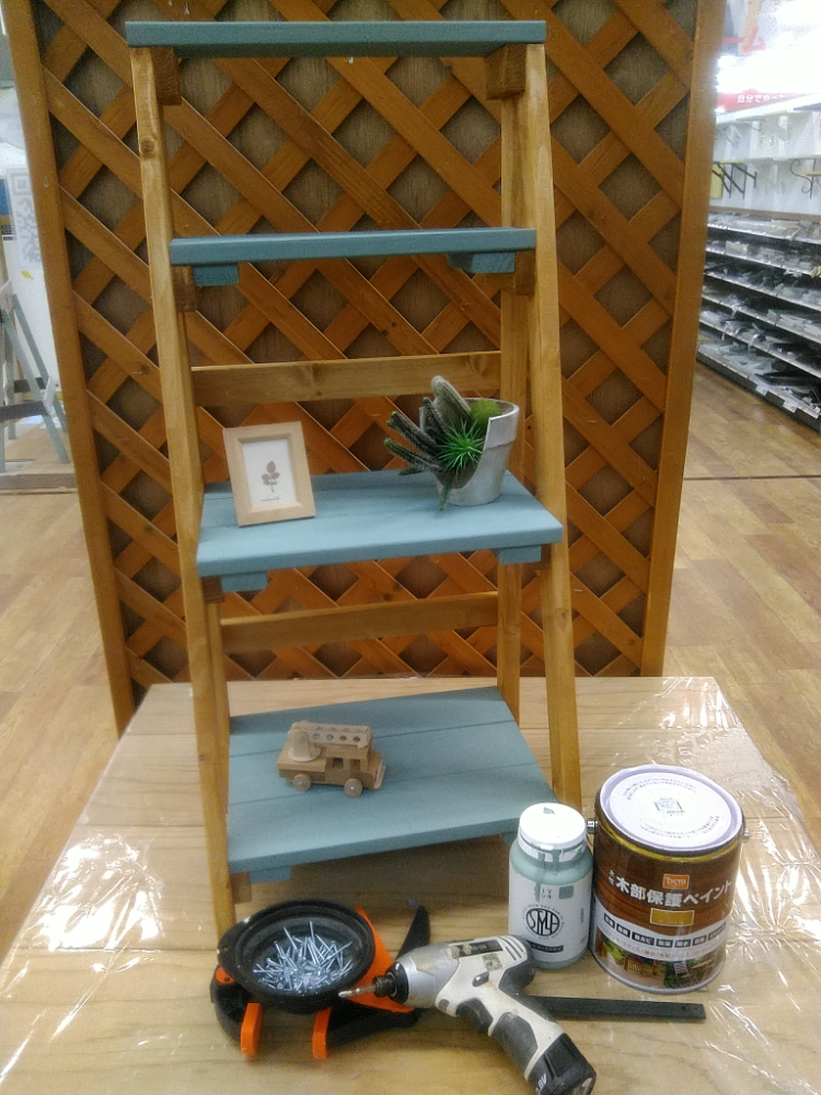 カット済みの木材を電動工具で組み立て、ワックスと水性塗料でペイントします。棚板を脚部にはめ込むだけで組み立てができるので、持ち運びにも便利です。キャンプなどのアウトドアだけでなく、インテリアとしても活躍しそう♪棚と脚の色を工夫してオリジナルのラックをつくりましょう!