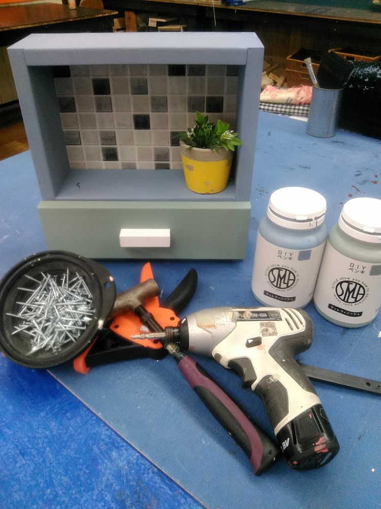 【午前1回の開催です】カット済みの木材を電動工具で組み立て、水性塗料やワックスなどでペイントします。小さめの観葉植物や多肉植物のディスプレイにおすすめの作品です。それぞれのボックスは取り外して持ち運べるので、お手入れや入れ替えも便利です。