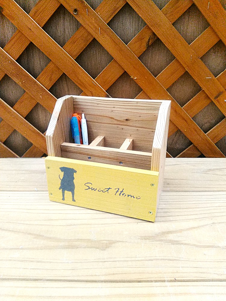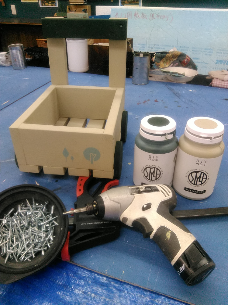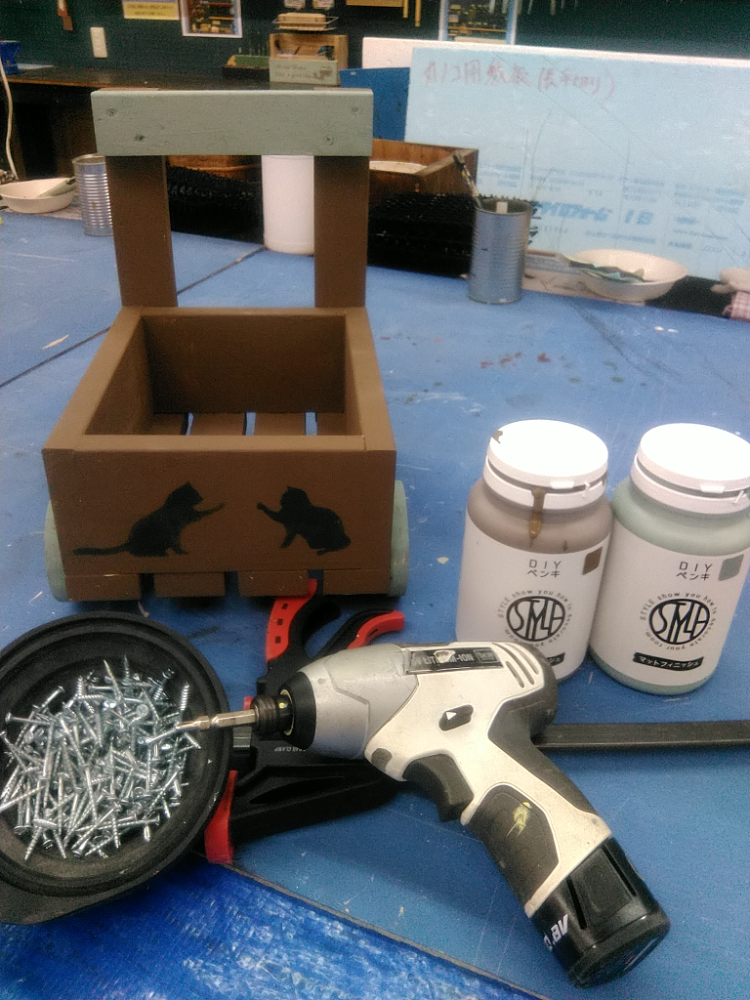 カット済みの木材を電動工具で組み立てます。水性塗料でペイントし、ステンシルで仕上げましょう。お花用のプランターとしてだけでなく、お子さまのおもちゃ箱としても使えます。カート型でかわいいので子供部屋にもピッタリです!