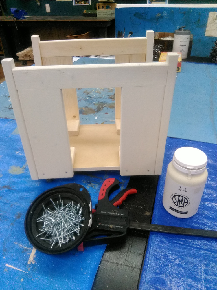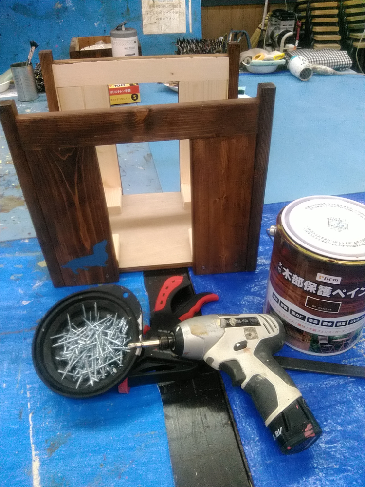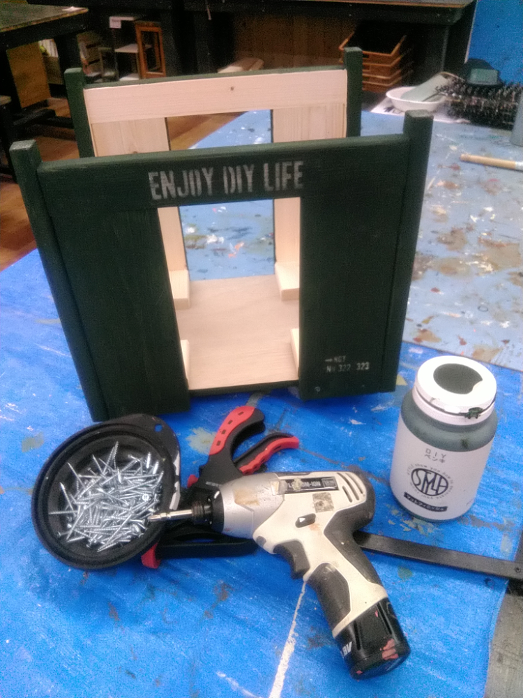 【午前1回の開催です】カット済みの木材を電動工具で組み立て、ワックスと水性塗料でペイントし、ステンシルで仕上げます。防災用品や園芸用品など収納力抜群!玄関先で荷物を置いたり、軽く腰掛けたり、収納もできる実用性の高い作品です。ちょっとしたコツが必要な”蝶番”の取り付け方も学べます。