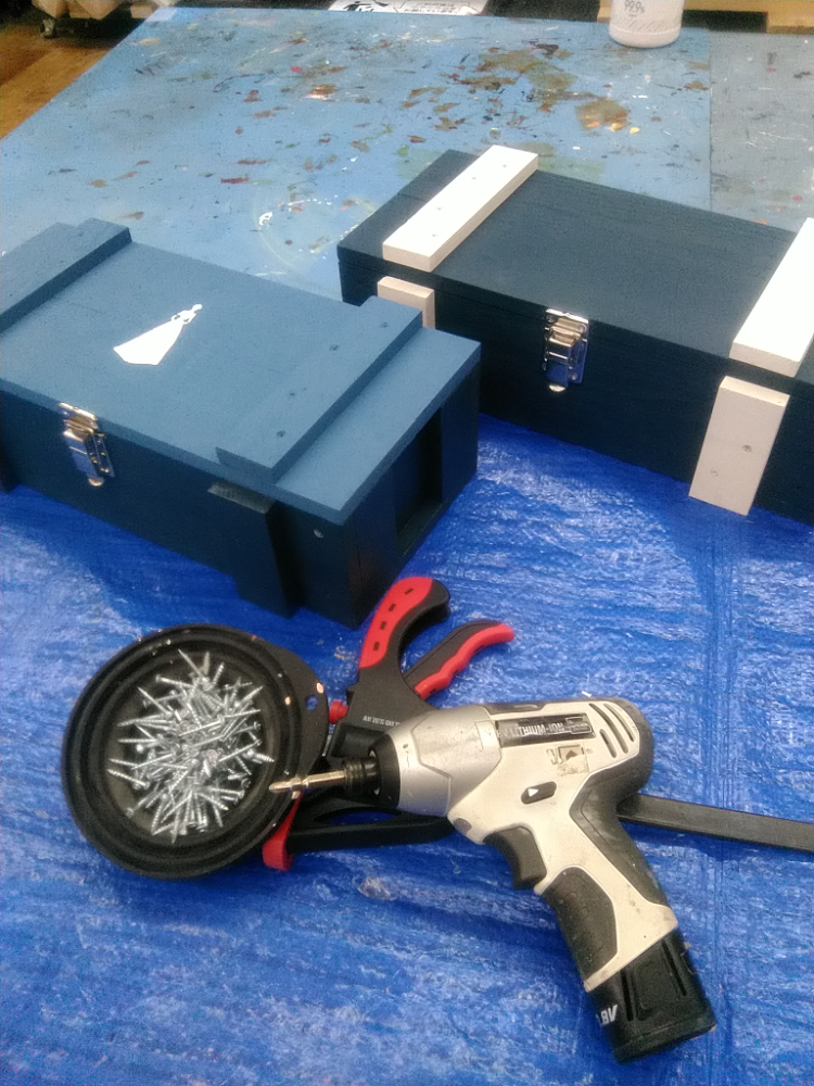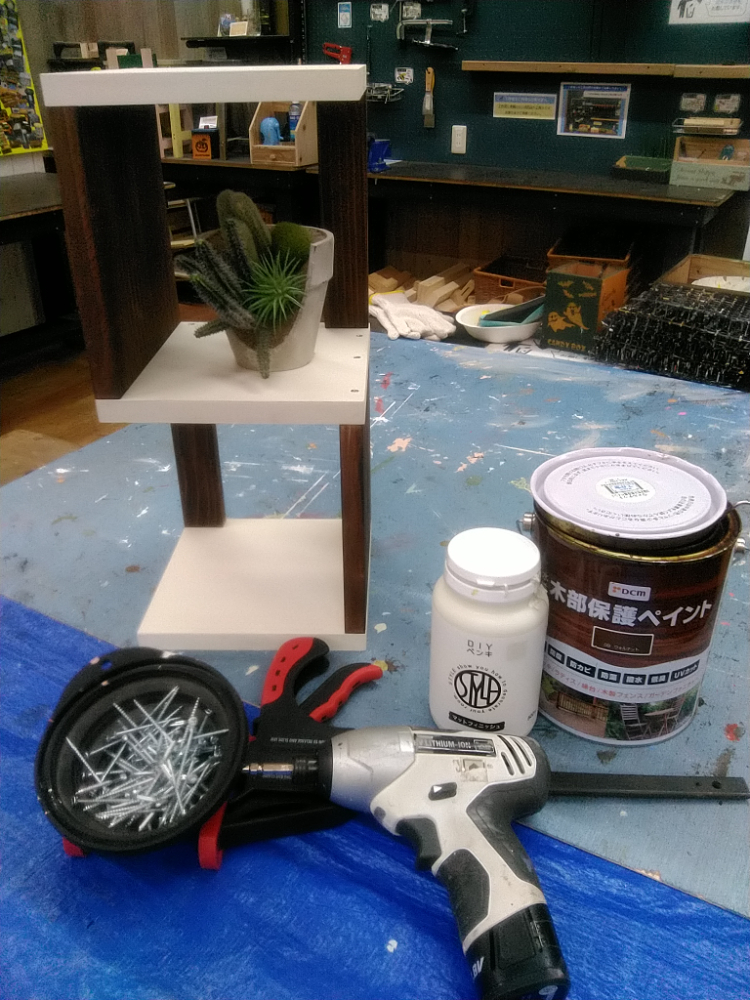 カット済みの木材を電動工具で組み立て、木部保護塗料でペイントします。花台部分と壁面へ花や雑貨と併せて飾ったり、目隠しとしても活躍します。