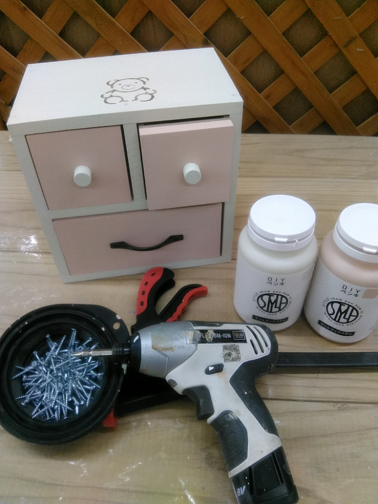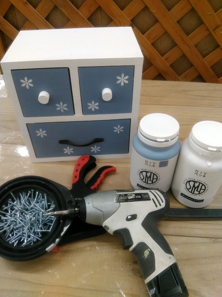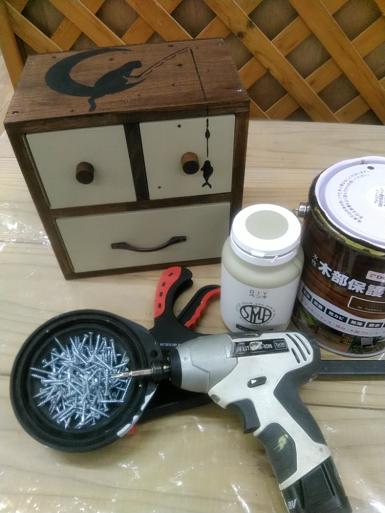 【午前1回の開催です】カット済みの木材を電動工具で組み立て、ワックスと水性塗料でペイントし、ステンシルで仕上げます。防災用品や園芸用品など収納力抜群!玄関先で荷物を置いたり、軽く腰掛けたり、収納もできる実用性の高い作品です。ちょっとしたコツが必要な”蝶番”の取り付け方も学べます。