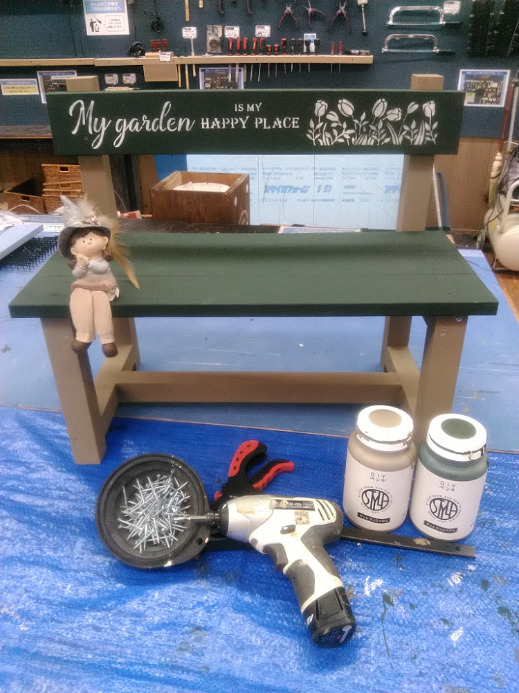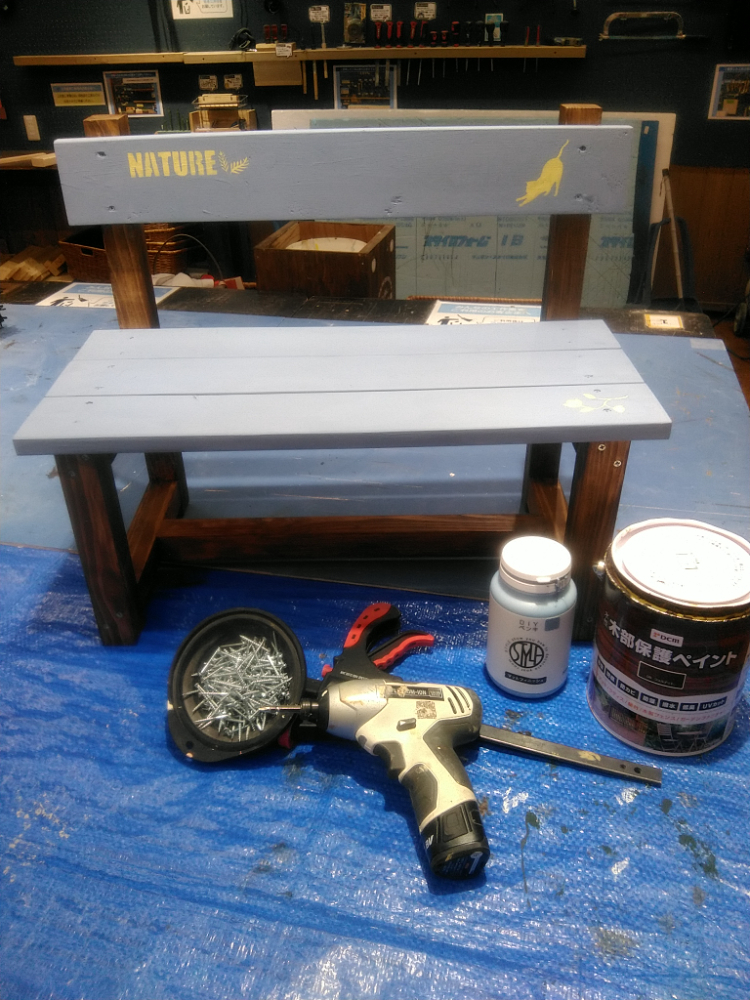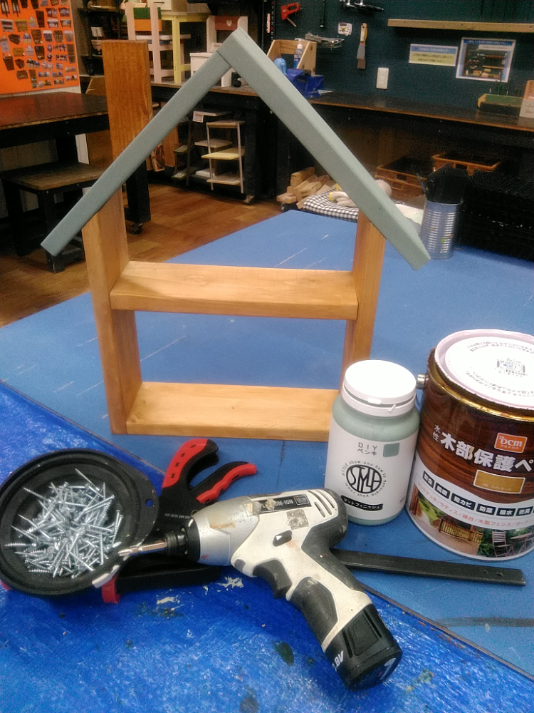 【午前1回の開催です】カット済みの木材を電動工具で組み立て、水性塗料やワックス等でペイントします。シンプルなデザインなので、小物を飾ったりお部屋の整頓にオススメです。