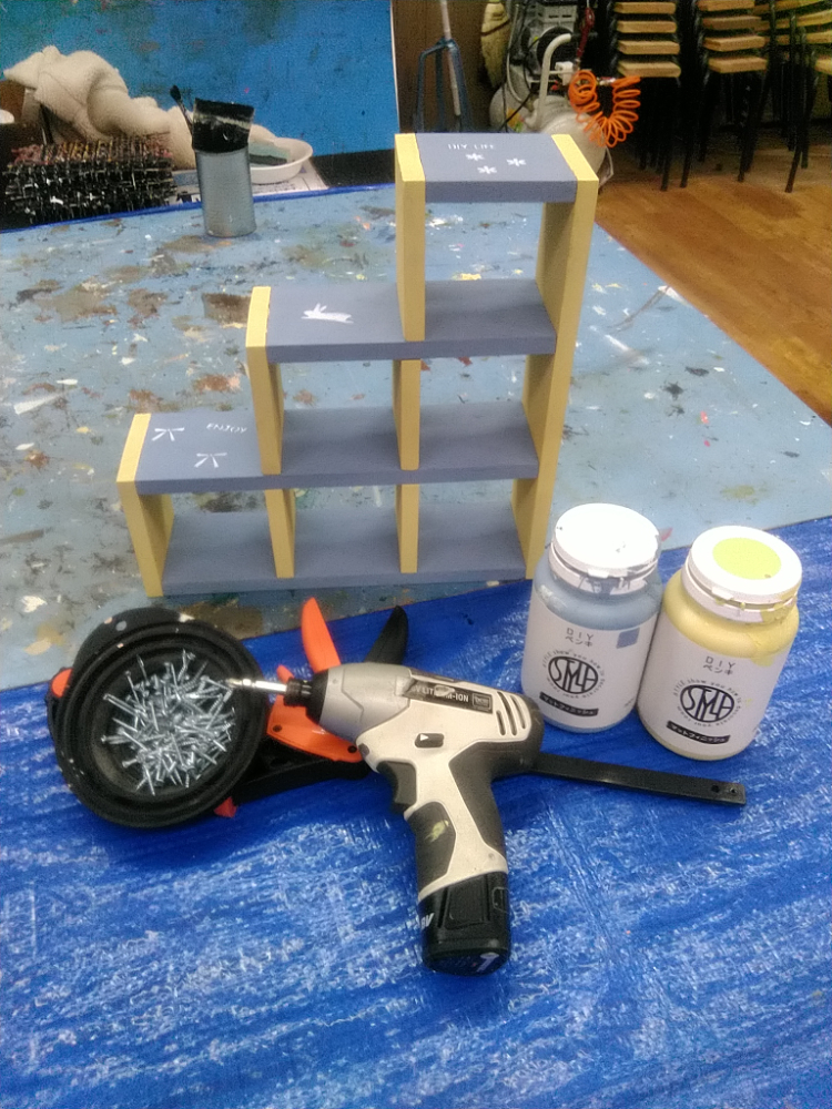 カット済みの木材を電動工具で組立てて、水性塗料でペイントします。ツリー型のラックに自分だけのクリスマスの飾りつけをしてみませんか?