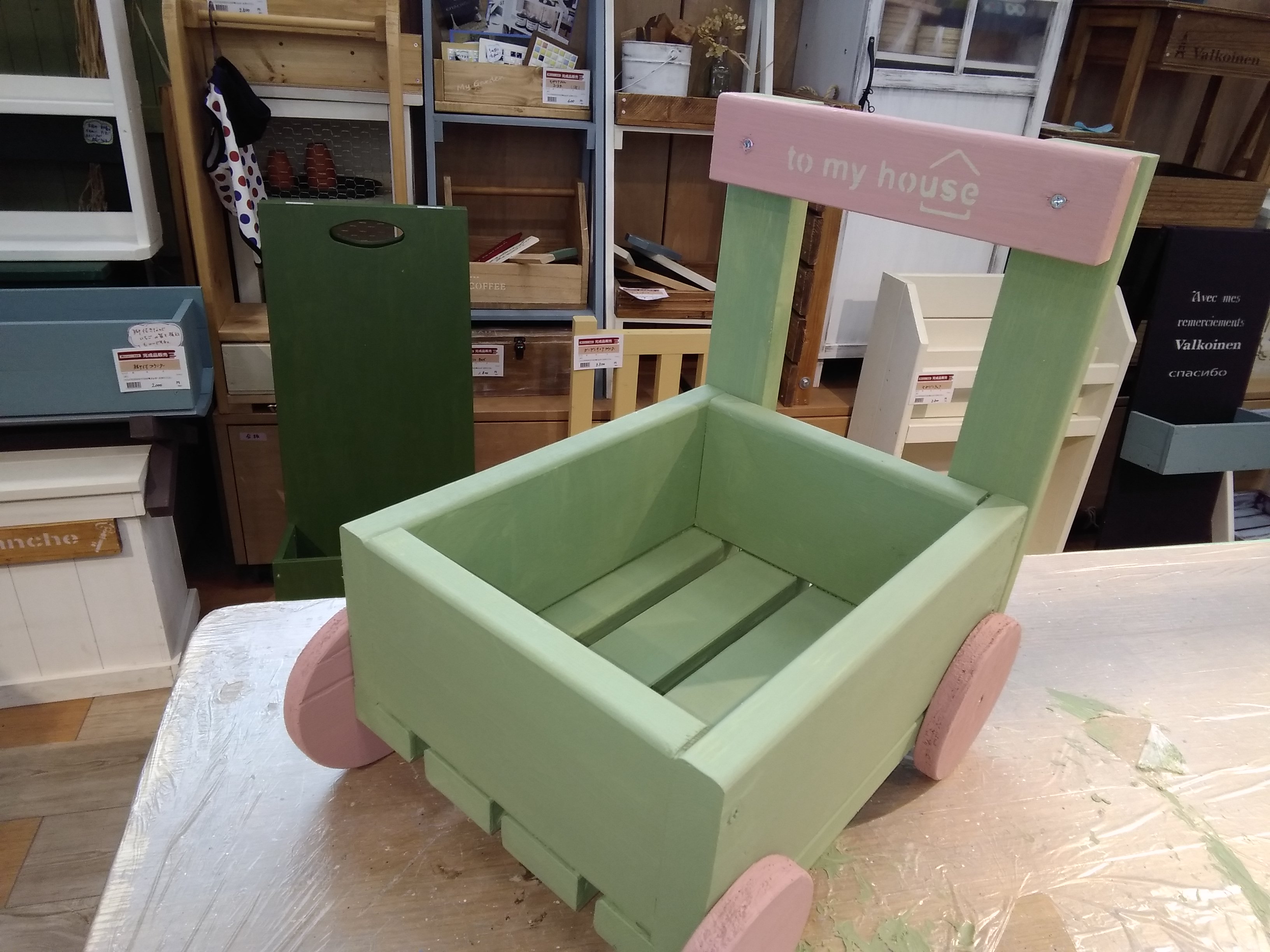 カット済みの木材を電動工具で組み立て、ワックスでペイントします。懐かしのイスは横にして作業台として使う他、花台やサイドテーブルとしても活躍する注目の作品です。