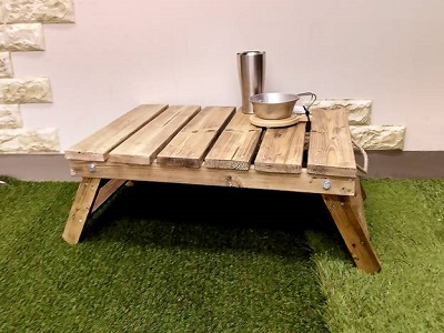 【午前1回の開催です】カット済みの木材を電動工具で組み立て、ワックスでペイントします。天板の内側に足をたため、取っ手のひも付きなので持ち運びも便利です!ご自宅だけでなくキャンプやBBQなどアウトドアライフも自作ギアで楽しみませんか?