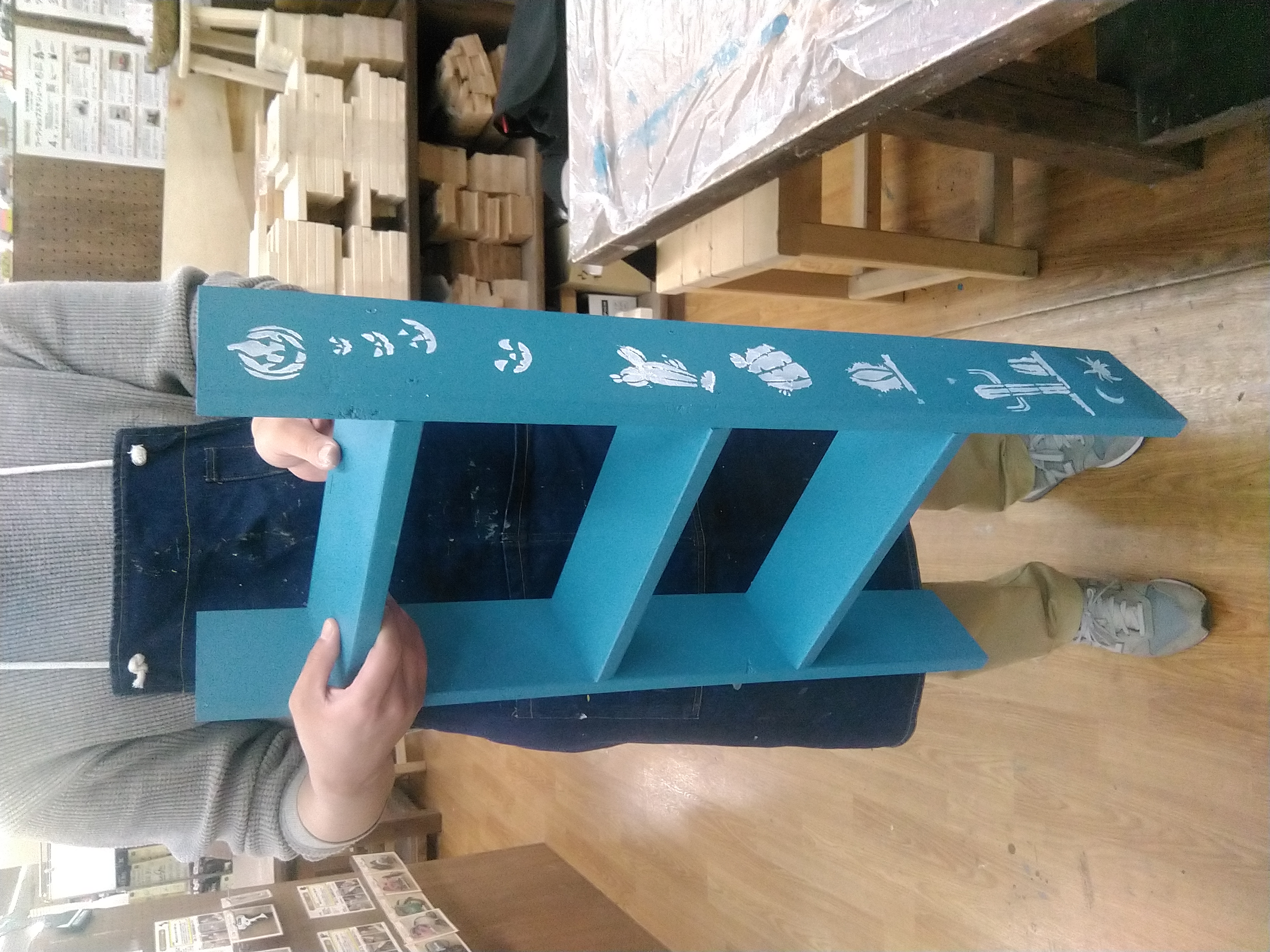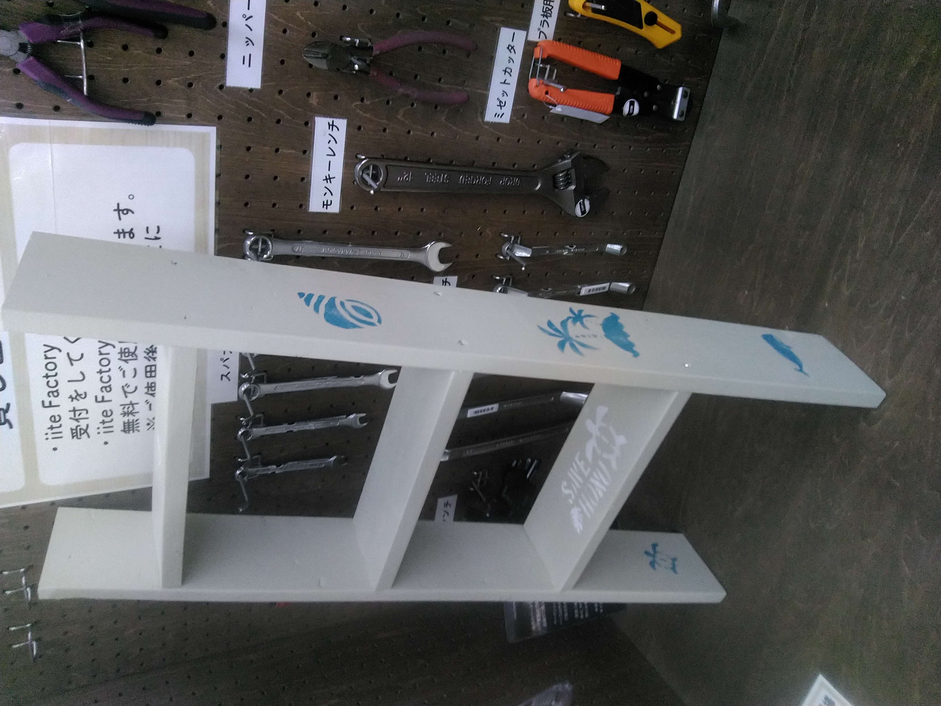 【午前1回の開催です】カット済みの木材を電動工具で組み立て、ワックスと水性塗料でペイントします。棚板を脚部にはめ込むだけで組み立てができ、持ち運びにも便利です。