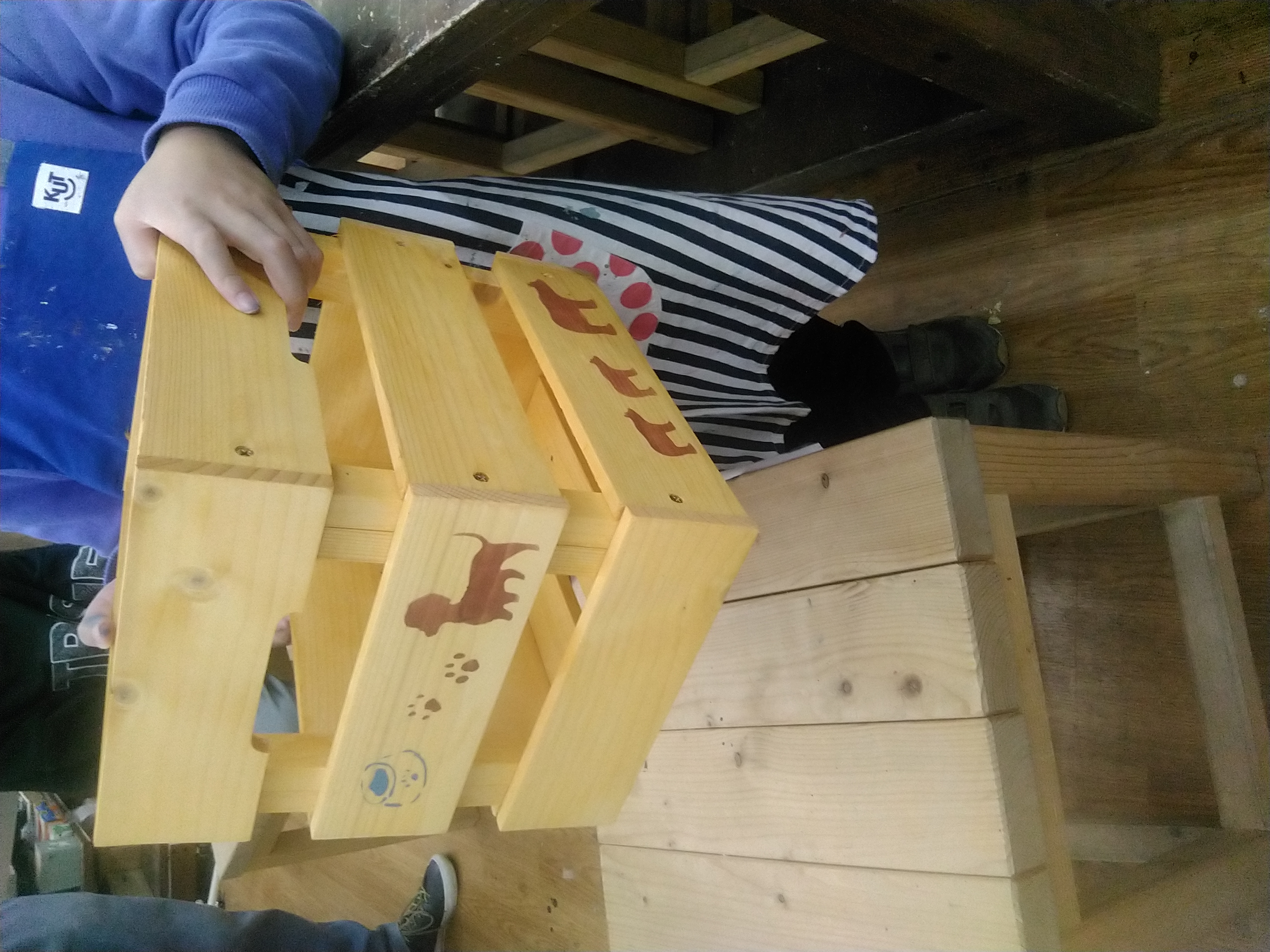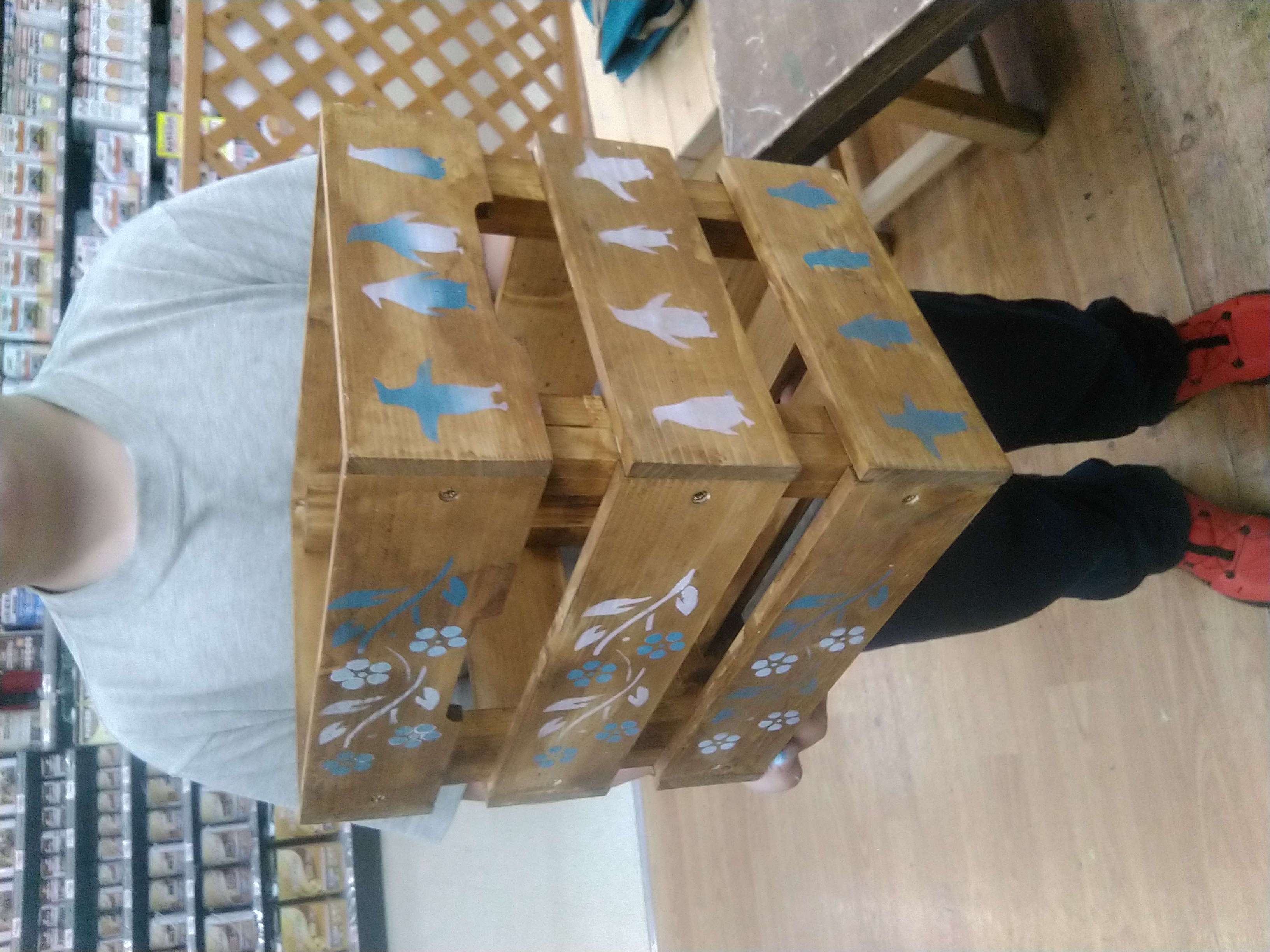 カット済みの木材をワックスか水性塗料でペイントし、電動工具で組み立てます。下穴加工済みなので誰でも手軽にDIY♪小物や小さな植物をディスプレイするのにピッタリな作品です。