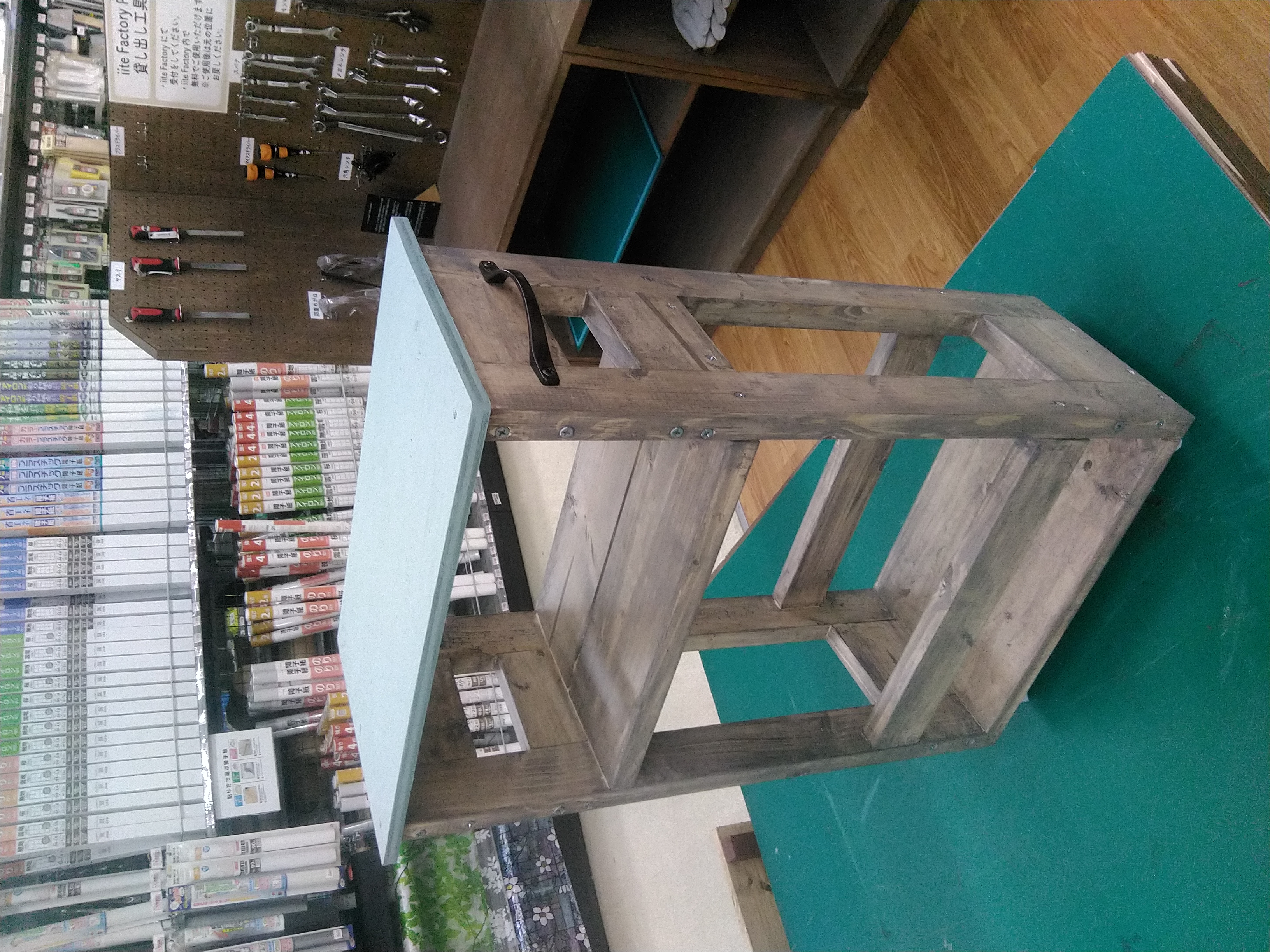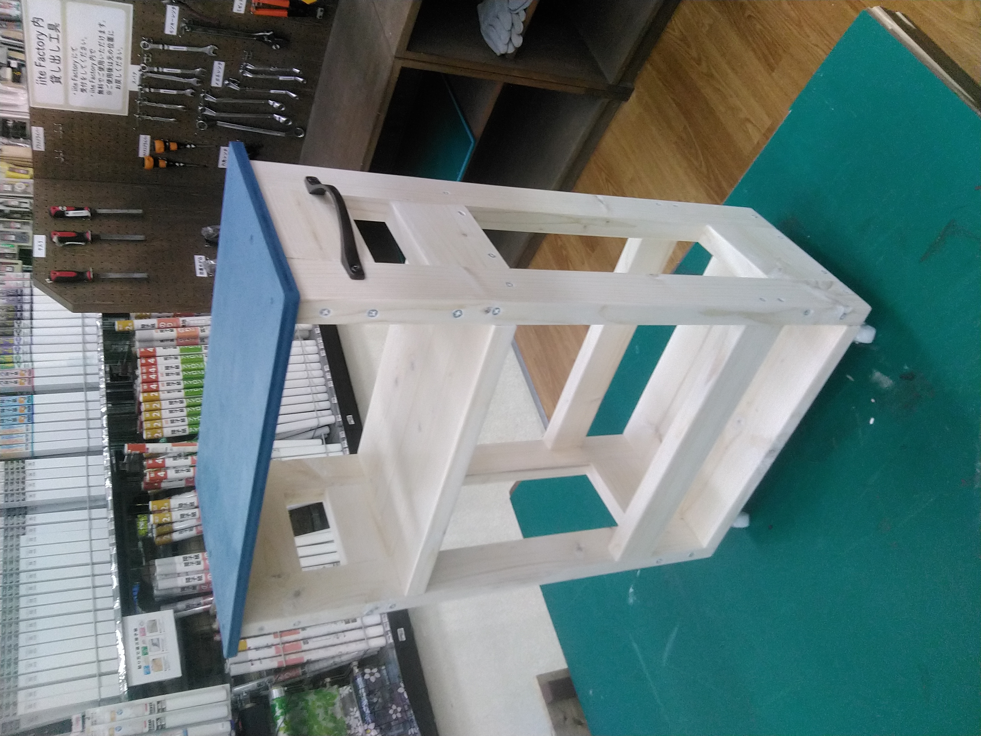 カット済みの木材を電動工具で組み立て、水性塗料でペイントします。カフェ風の屋根がポイントです。リビングやキッチン、お子さまのおままごとにもピッタリの棚を一緒に作りましょう。
