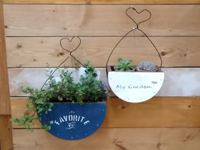 カット済みの木材を電動工具で組み立て、ペイントします。壁掛け式のオリジナル作品です。大(幅200mm)・小(幅150mm)2個製作します(寄せ植えはございません)。