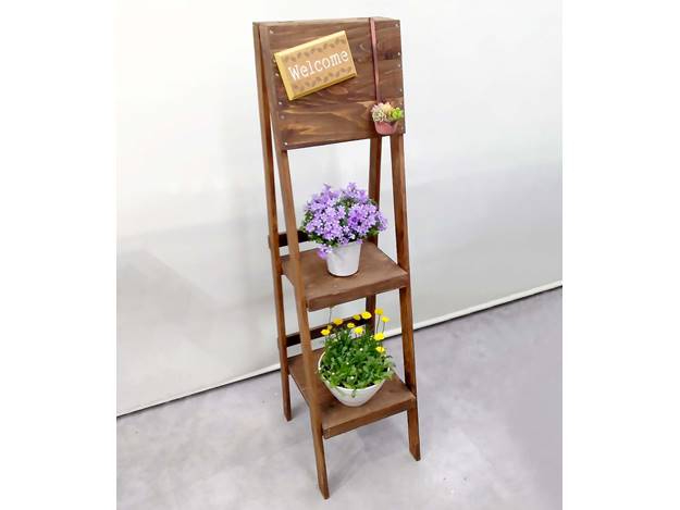 【午前1回の開催です】カット済みの木材を電動工具で組み立てて、木部保護塗料でペイントします。上段にはリースやハンギングバスケットが掛けられ、折りたたみ式で使用しない時は収納できます。道具や植物など、何に使うか楽しみになるラックです♪