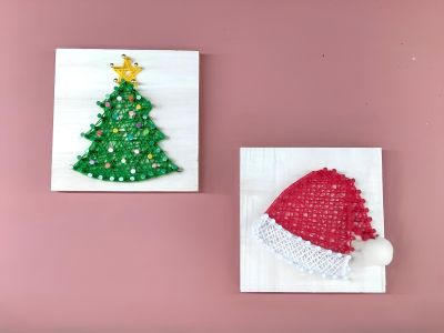 板に釘を打ち、糸を巻き付けていきます。釘が打ちやすいように便利な道具もあるので、簡単に制作できます。
