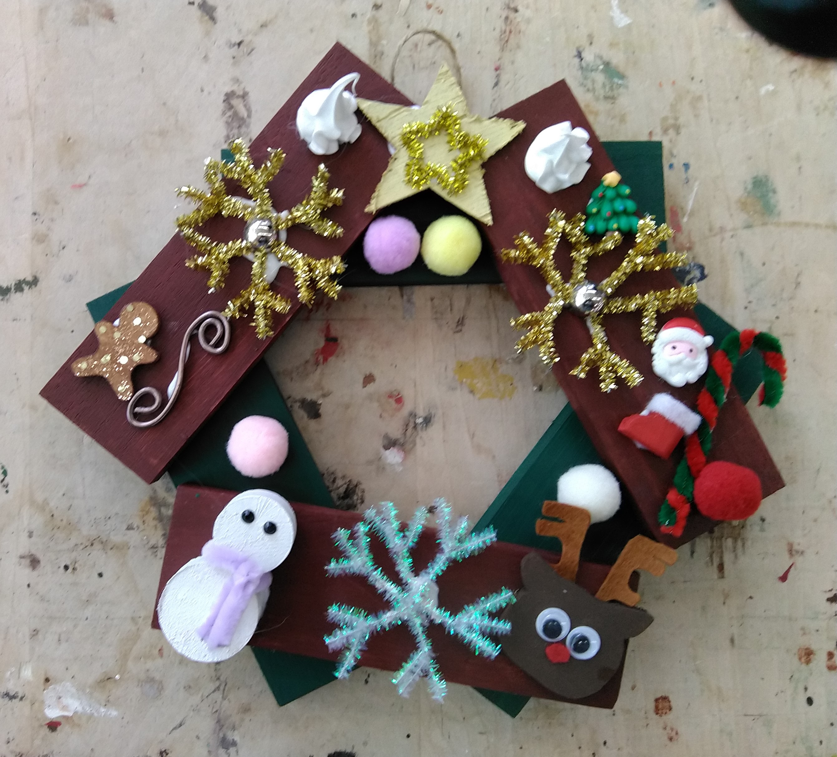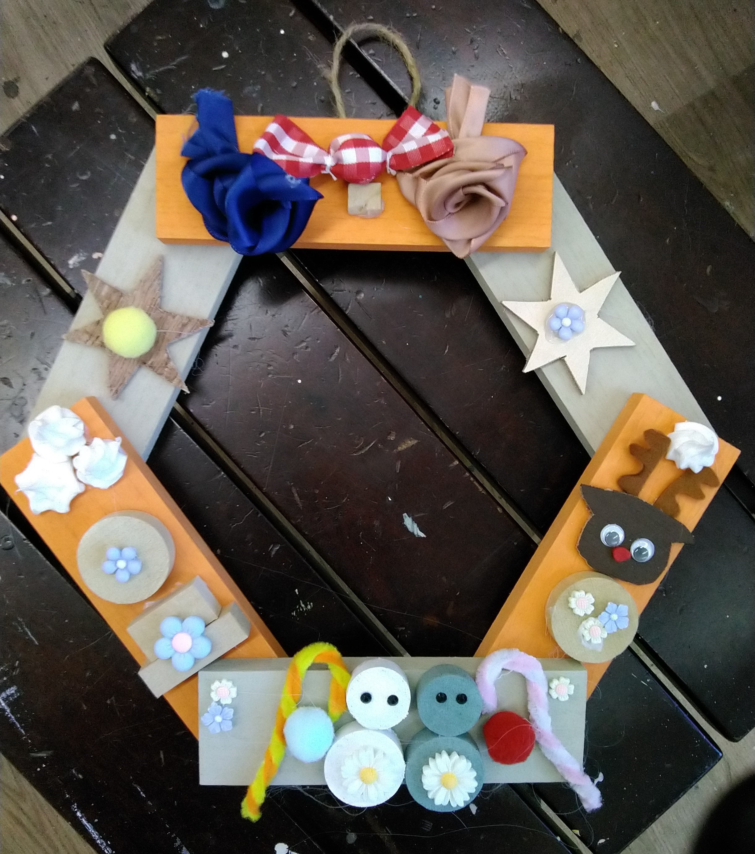 【サイズは木の組み方により異なります】カット済みの木材を水性塗料でペイントし、金づちで組み立てます。ステンシルや小さなパーツを飾りつけて自分だけの木のリースを作りましょう。