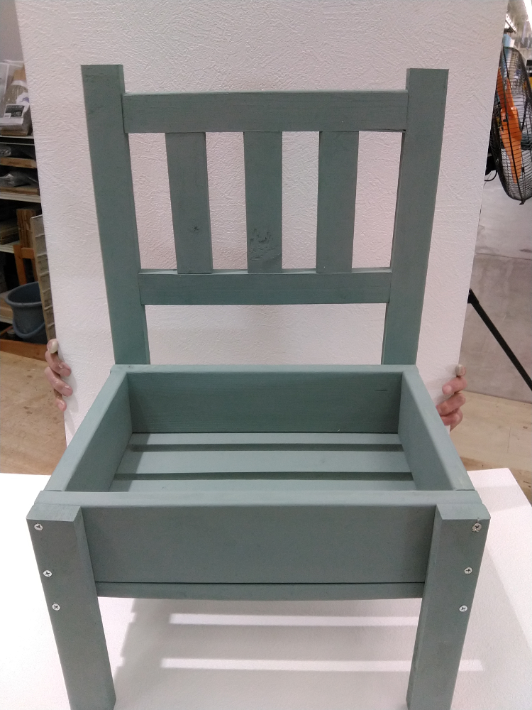 【午後1回の開催です】カット済みの木材を電動工具で組み立て、ワックスでペイントします。懐かしのイスは横にして作業台として使う他、花台やサイドテーブルとしても活躍する注目の作品です。