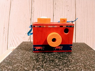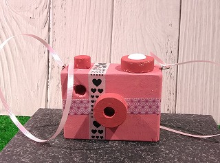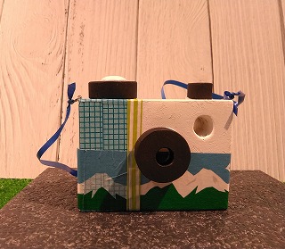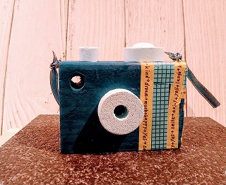 木材に水性塗料でペイントし、木工用接着剤でパーツを取り付けます。お子さまに大人気の木のカメラを思い思いに作ってみましょう。
