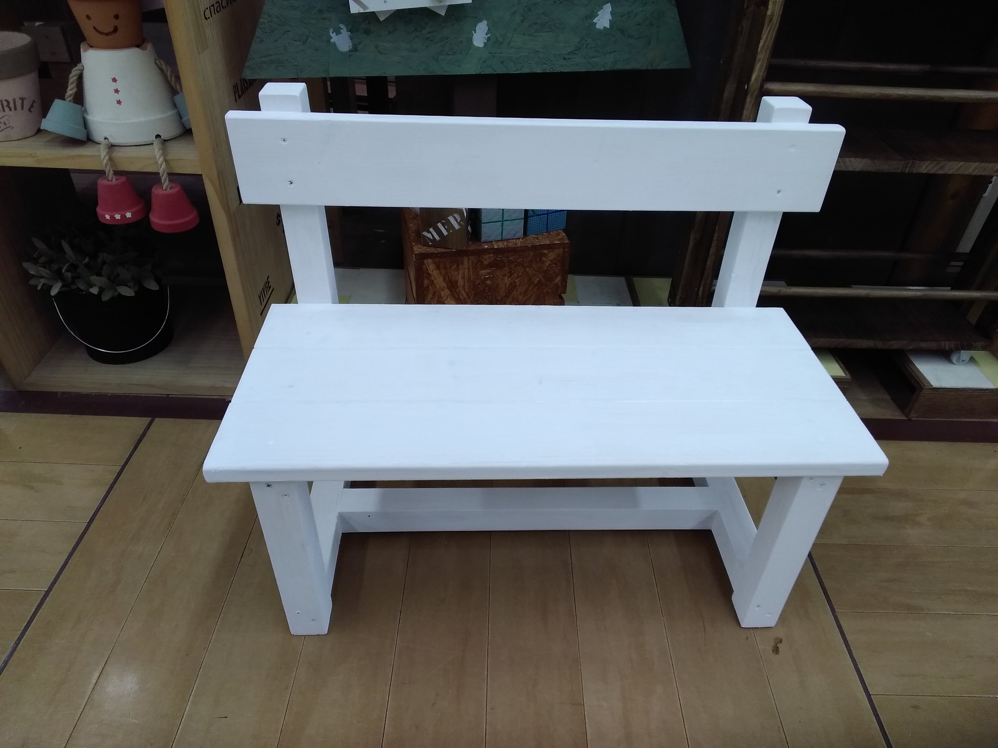 カット済みの木材を電動工具で組み立て、水性塗料やワックスなどでペイントします。ちょっと座ったり、小物や植物を飾ったりできる、やさしい雰囲気のベンチ型飾り棚です。