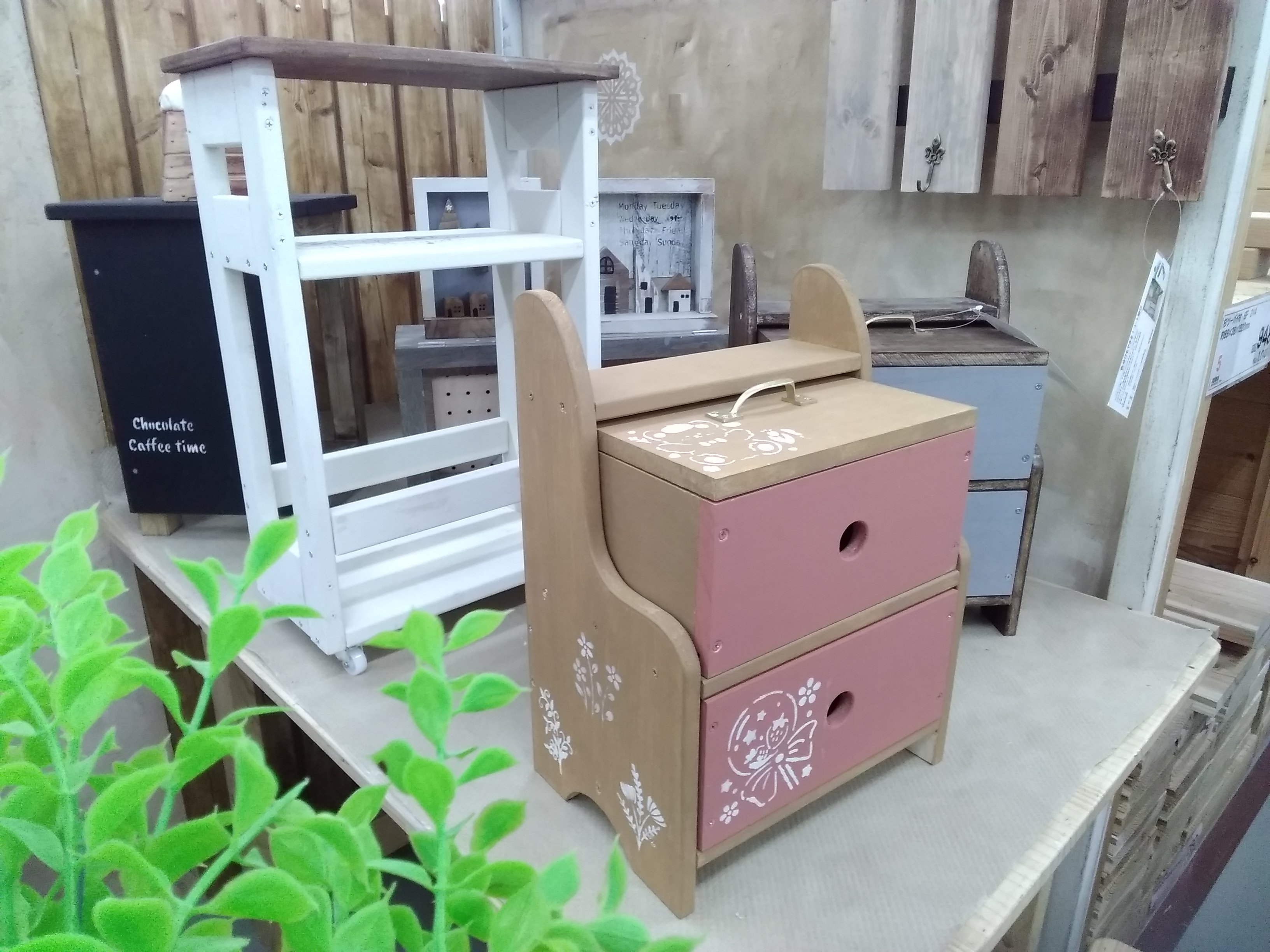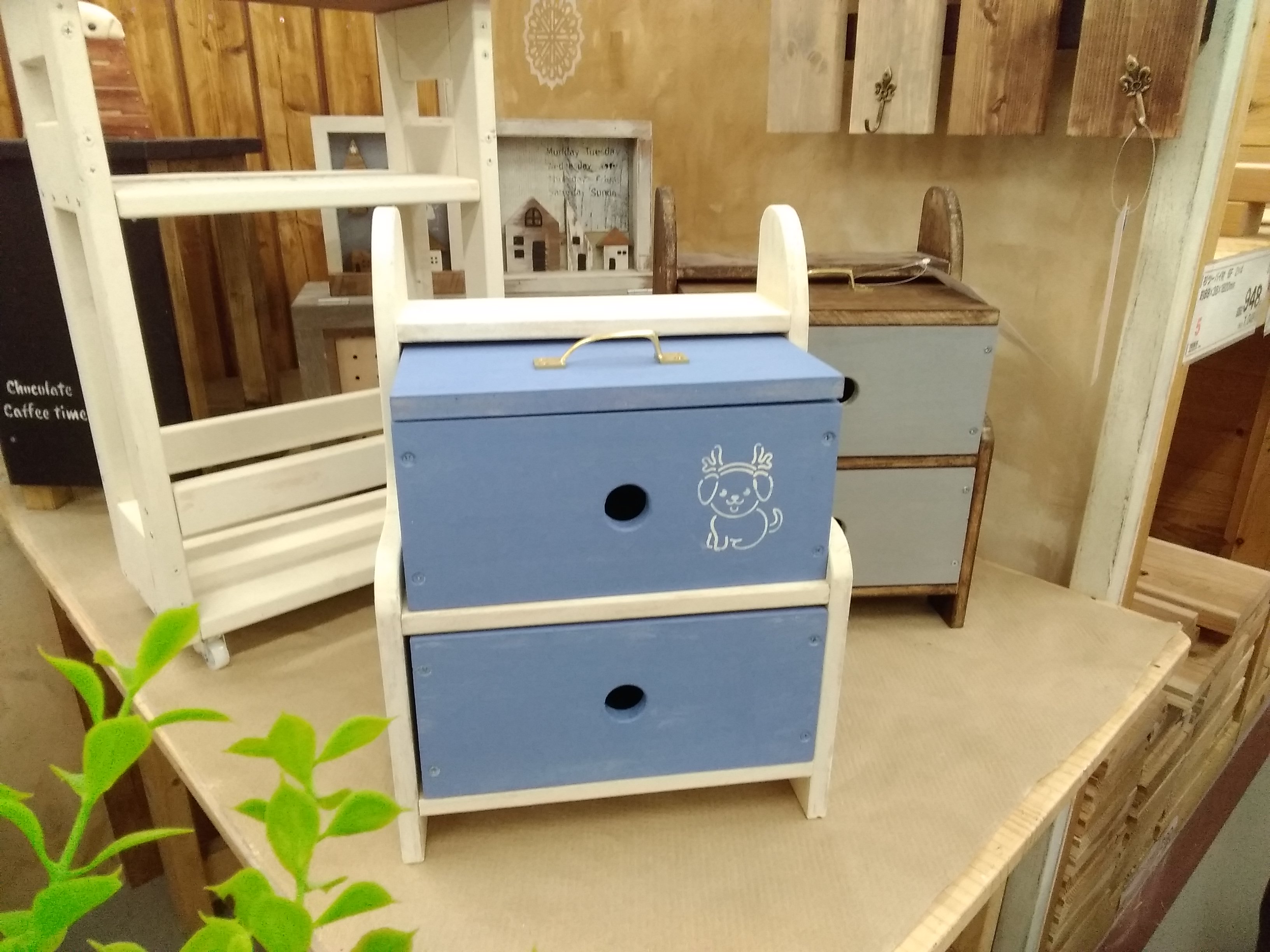 【午前1回の開催です】カット済の木材を電動工具で組み立て、水性塗料やワックスで塗装します。中に棚があるのでコップの収納などキッチン周りの収納に大活躍♪キッチンやリビングテーブルの上などちょっとした空間のインテリアにも可愛い作品です。